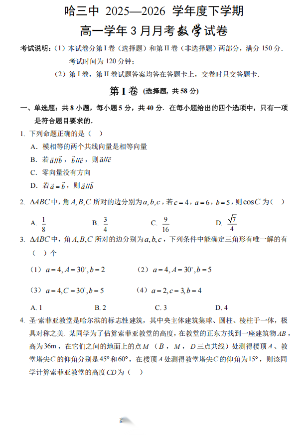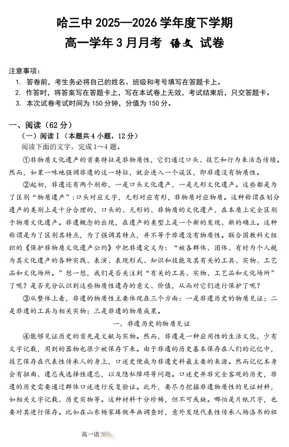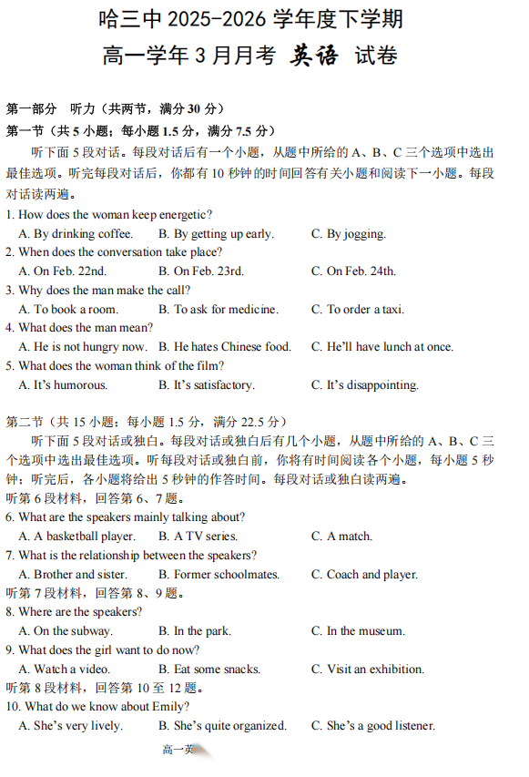 【百强校】【黑吉辽蒙卷】【高一】黑龙江省哈尔滨市第三中学2025—2026学年度下学期高一学年3月月考(3.30-3.31) 全科试题卷+答案