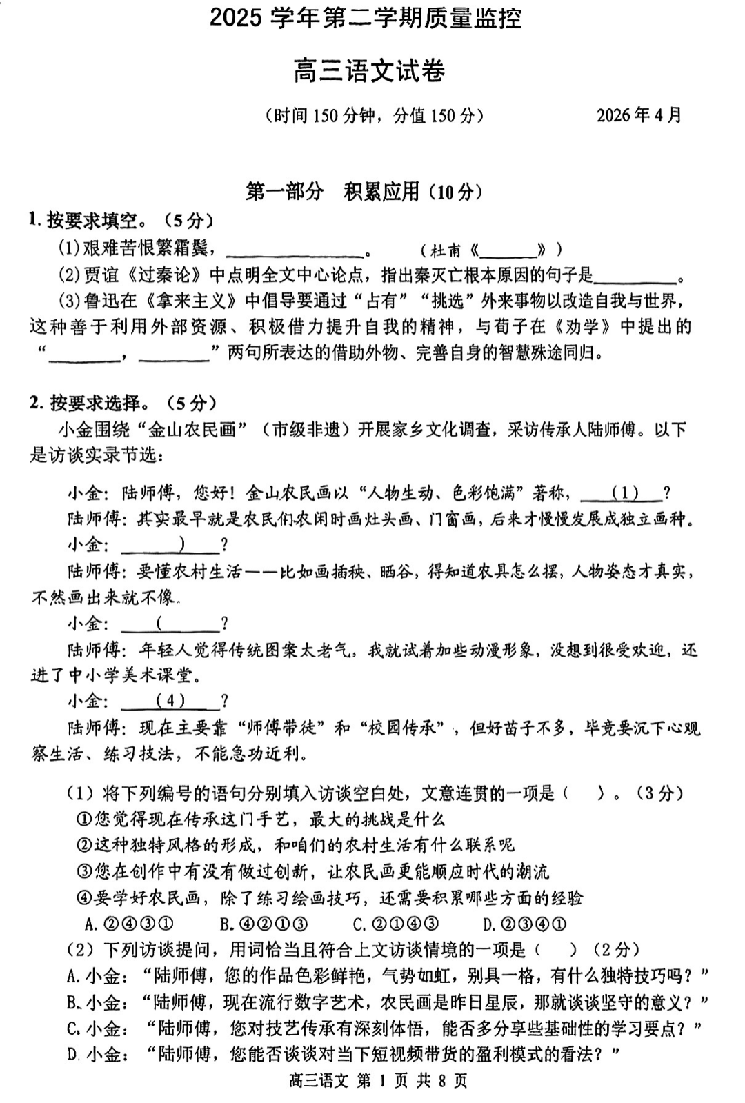 【上海卷】上海市金山区2026届高三年级2025学年第二学期质量监控(金山区高三二模)(4.1-4.2) 全科试题卷(缺历史)+答案