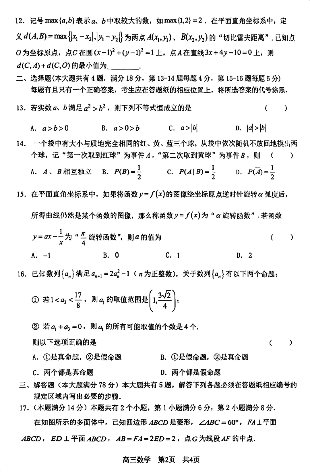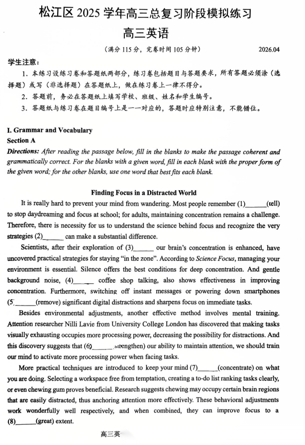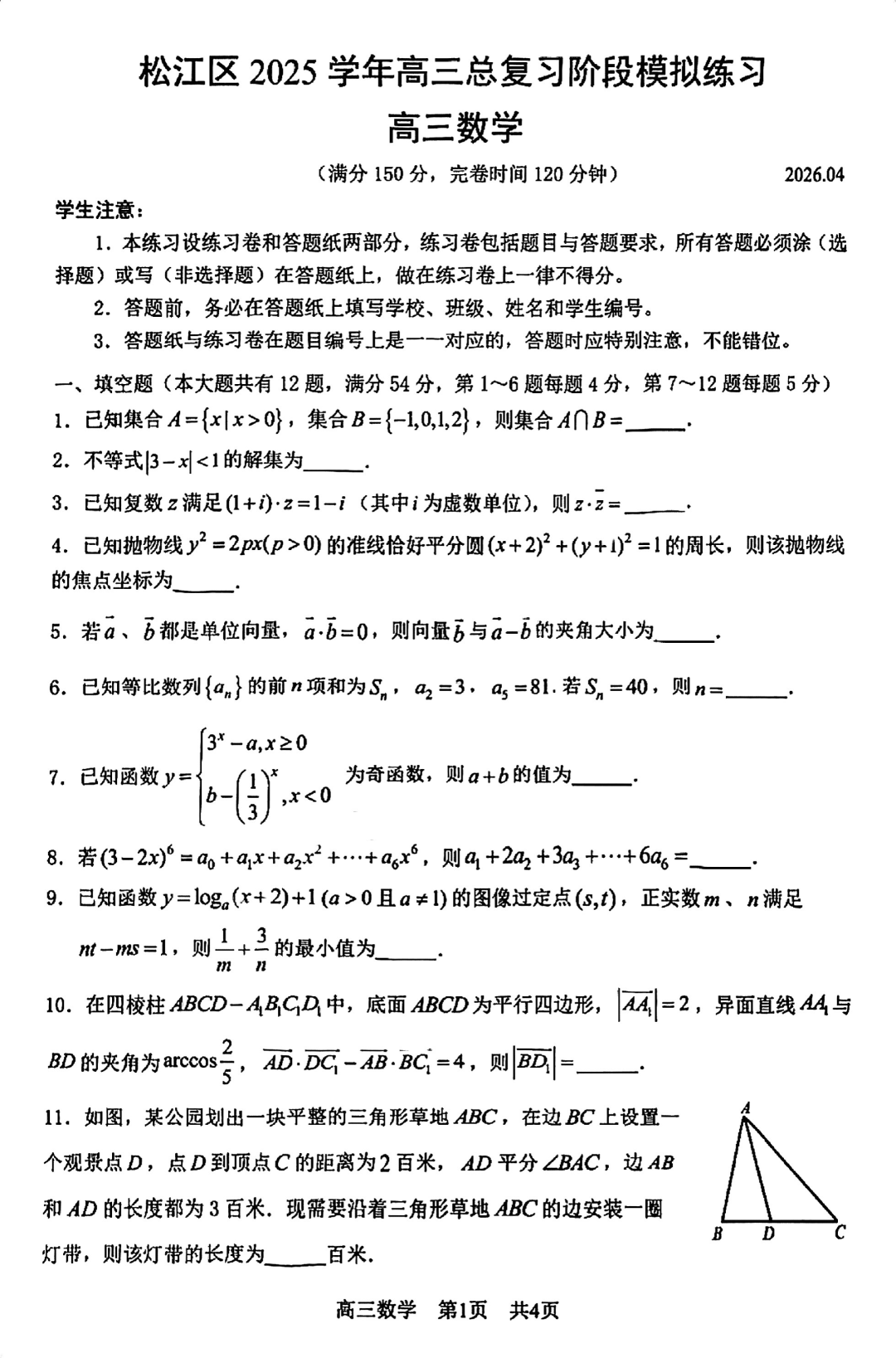【上海卷】上海市松江区2026届高三年级2025学年高三总复习阶段模拟练习(松江区二模)(4.1-4.2) 理科全科试题卷+答案