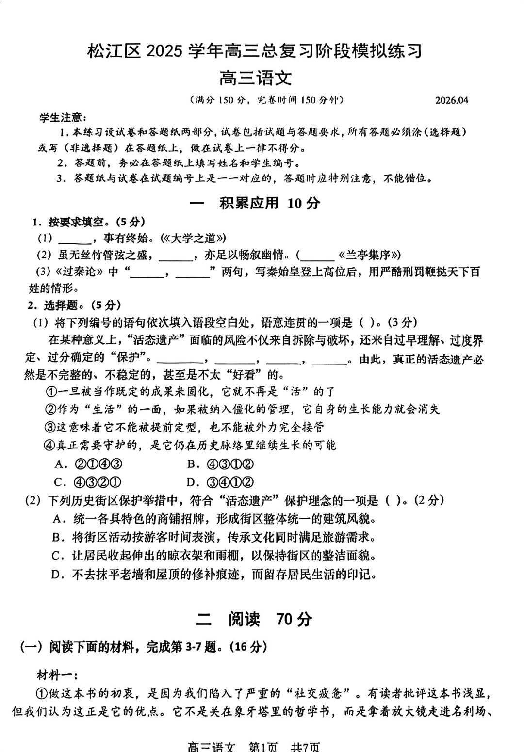 【上海卷】上海市金山区2026届高三年级2025学年第二学期质量监控(金山区高三二模)(4.1-4.2) 全科试题卷(缺历史)+答案 【上海卷】上海市金山区2026届高三年级2025学年第二学期质量监控(金山区高三二模)(4.1-4.2) 全...