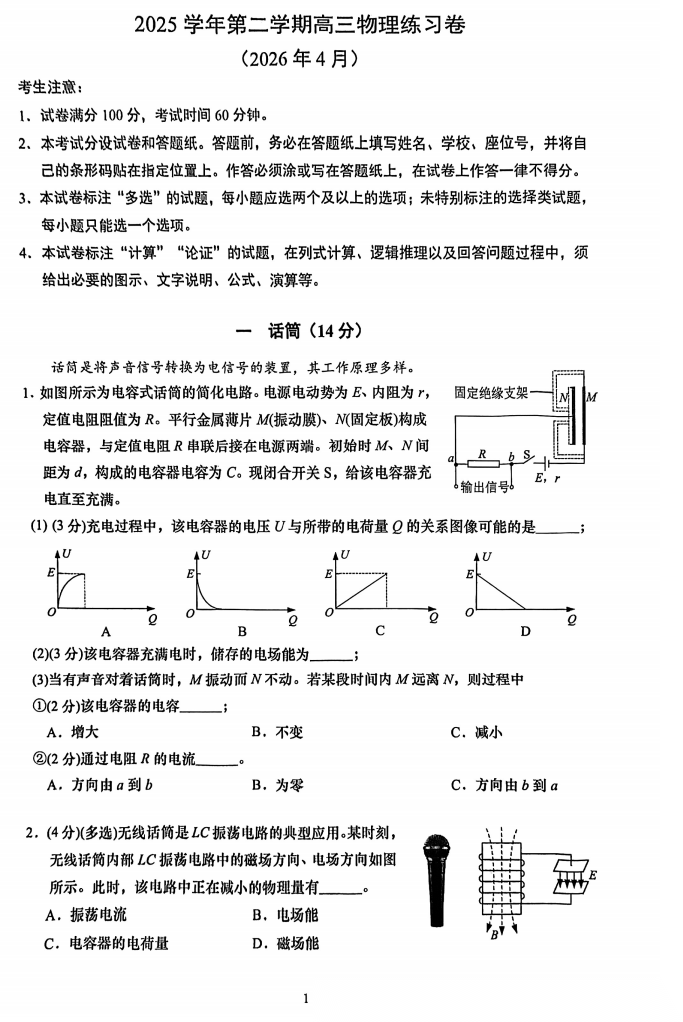 【上海卷】上海市奉贤区2026届高三年级2025学年第二学期高中练习卷(奉贤区高三二模)(4.1-4.2) 理科全科试题卷+答案