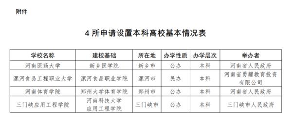 根据《中华人民共和国高等教育法》《中华人民共和国民办教育促进法》《普通本科学校设置暂行规定》《本科层次职业学校设置标准(试行)》等法律法规和有关政策规定,省教育厅对新乡医学院更名河南医药大学,设立漯河食品工程职业大学、河南体育学院、三门峡应用工程学院进行了考察,现予公示。