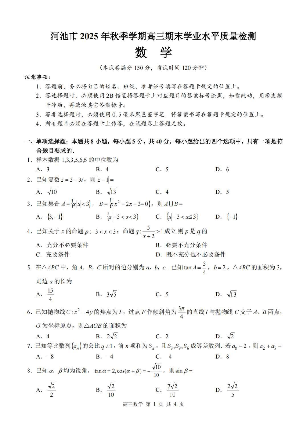 河池市2025年秋季高三期末学业水平质量检测下载