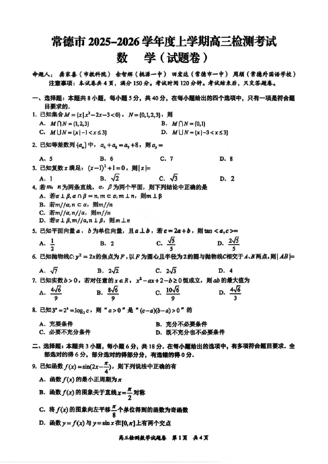 湖南省常德市2026届高三上学期2月期末检测考试(常德一模)