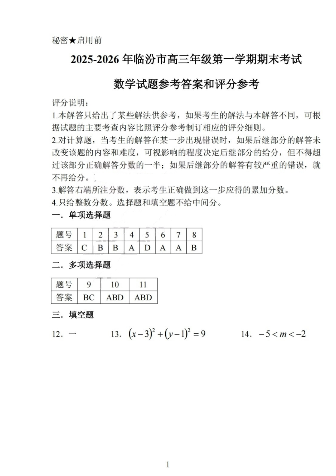 【全科】临汾市高三年级2025-2026学年度第一学期期末考试