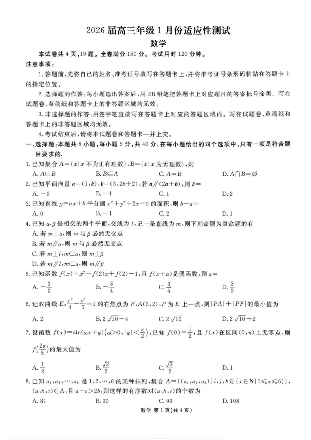 【超清无水印】:高三,衡水金卷-2026届高三年级1月份适应性测试全科试卷含答案