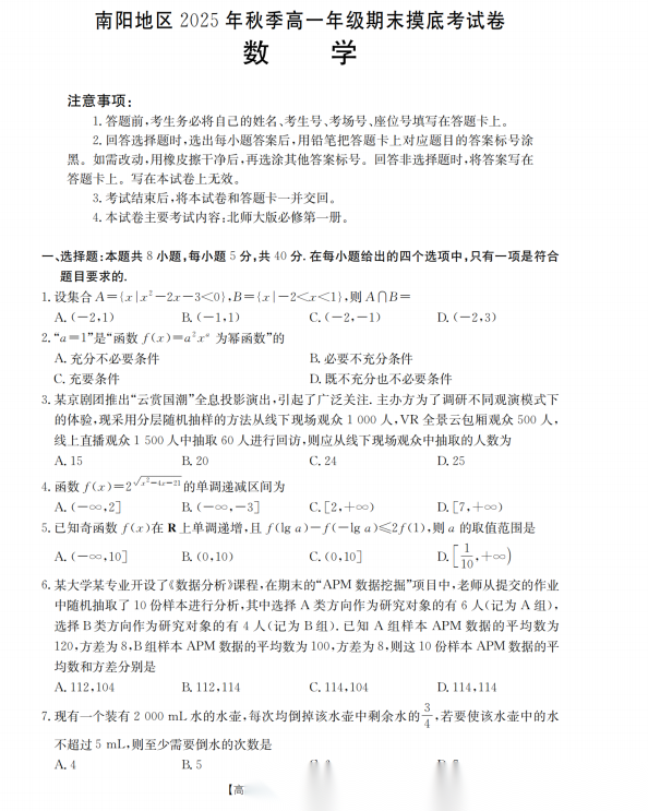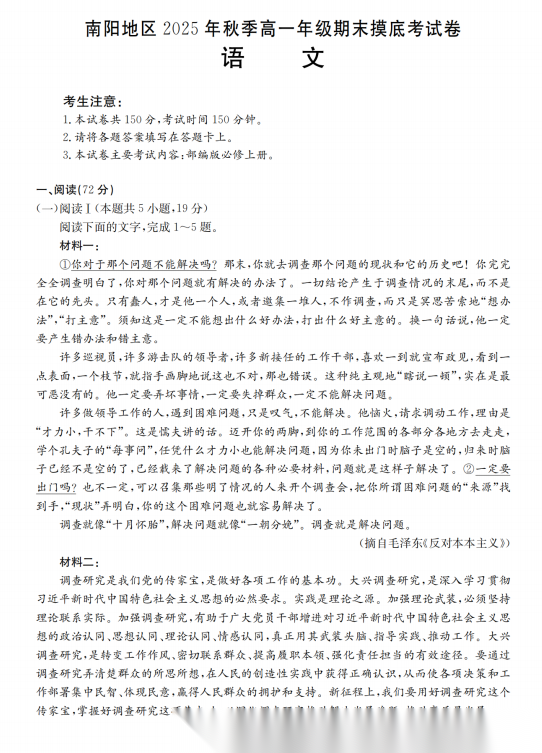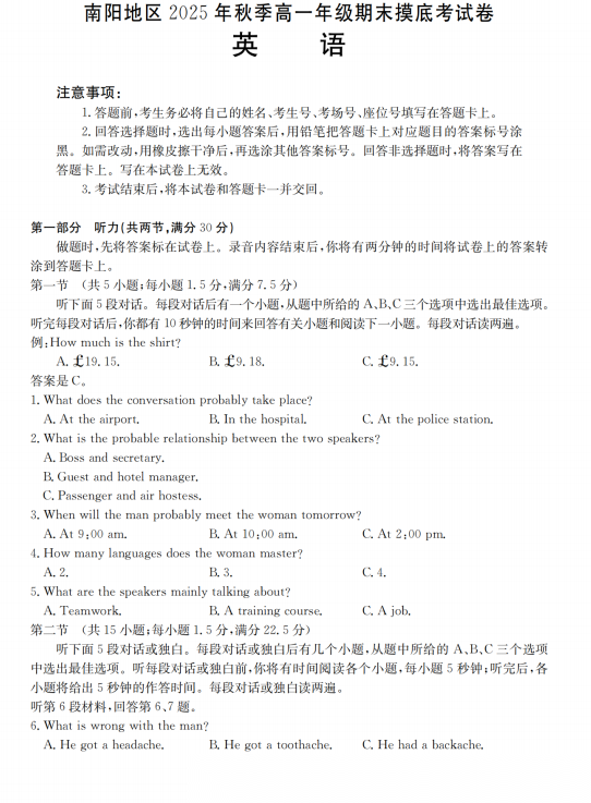 【河南卷】【高一】河南省南阳地区2025年秋季高一年级上学期期末摸底考试卷(2.5-2.6) 全科试卷+答案