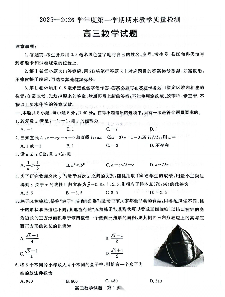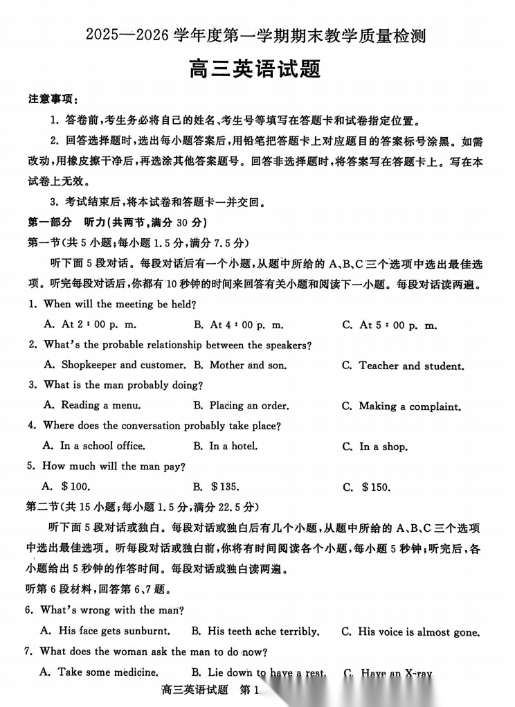 【山东卷】山东省聊城市2025-2026学年度第一学期高三年级期末教学质量检测(2.7-2.9) 全科试题卷+答案