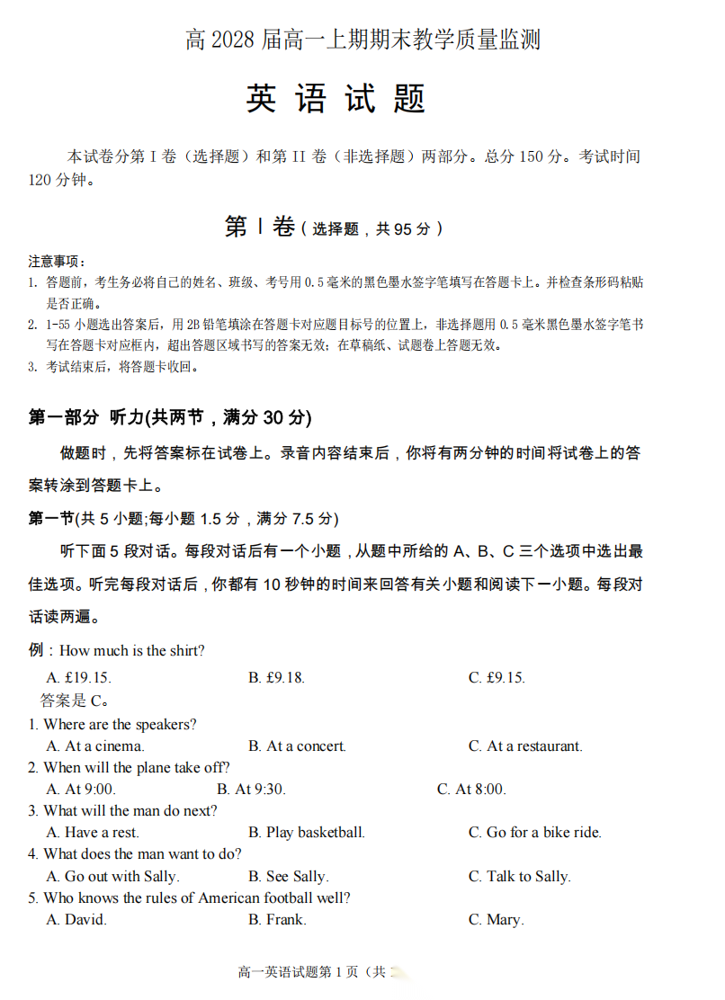【四川卷】【高二】四川省遂宁市2027届高二年级上学期期末教学质量监测考试(1.28-1.30) 全科试卷+答案 【四川卷】【高二】四川省遂宁市2027届高二年级上学期期末教学质量监测考试(1.28-1.30) ...