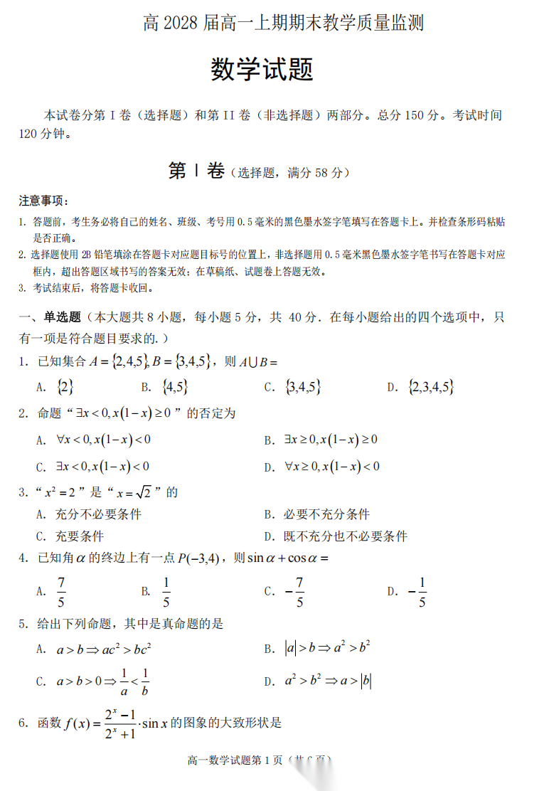 【四川卷】【高一】四川省遂宁市高2028届高一年级上学期期末教学质量监测考试(1.28-1.30) 全科试卷(无史地)+答案