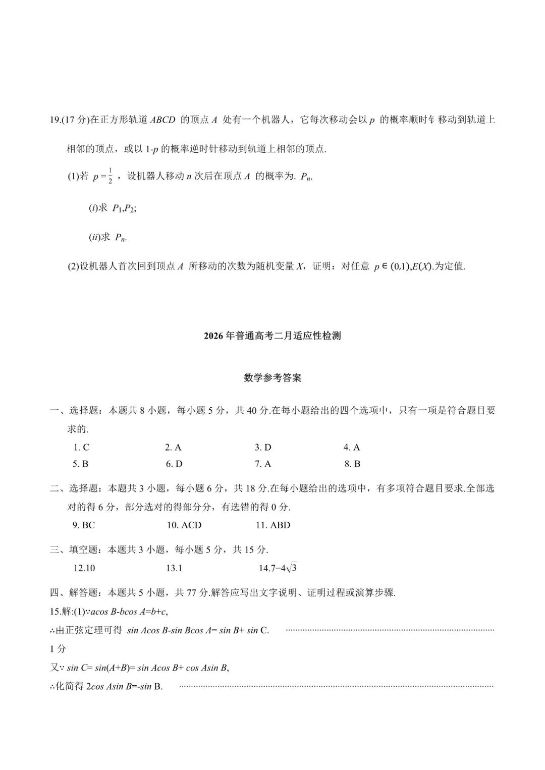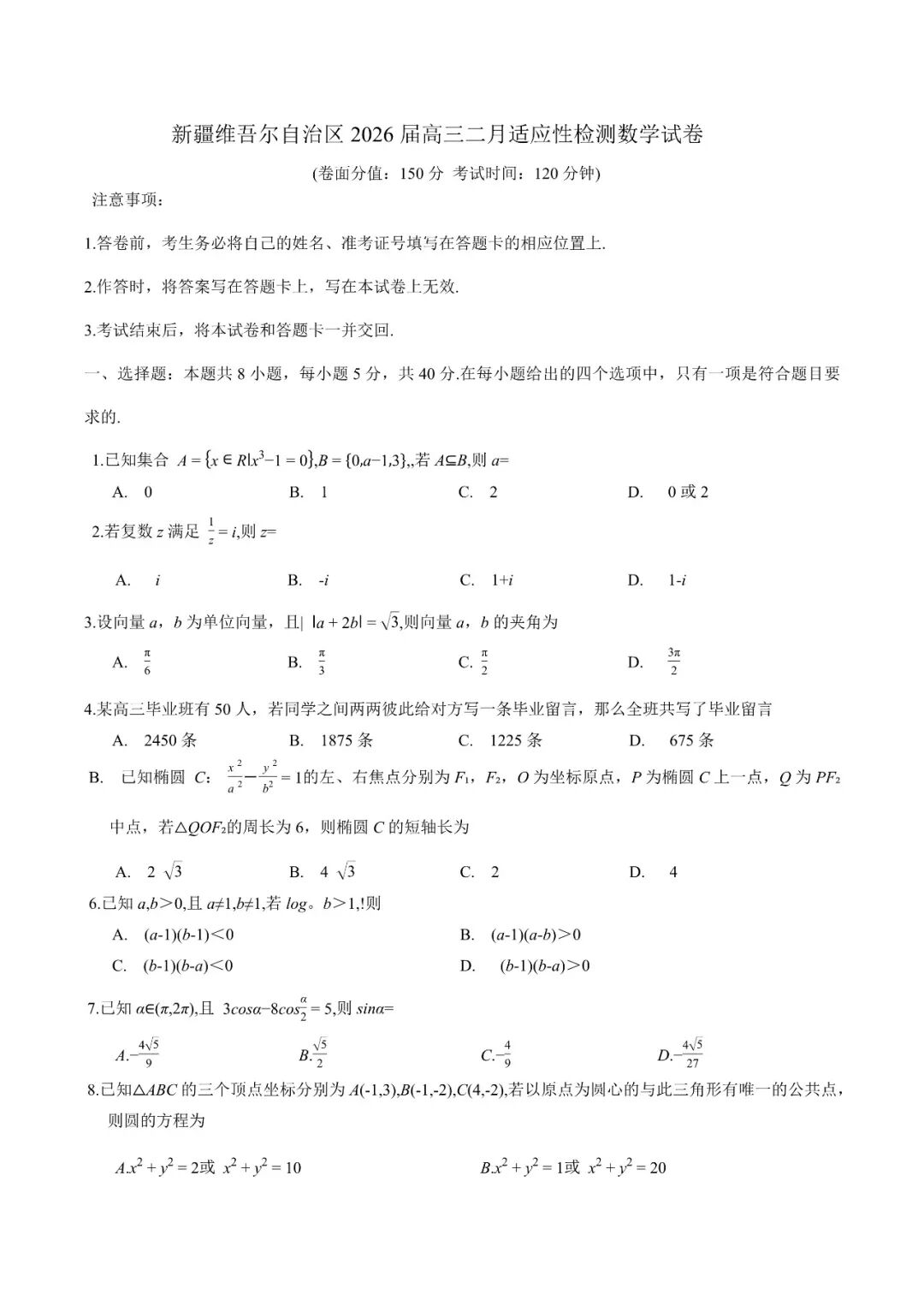 【全科】2026届新疆高三上学期普通高考二月适应性检测