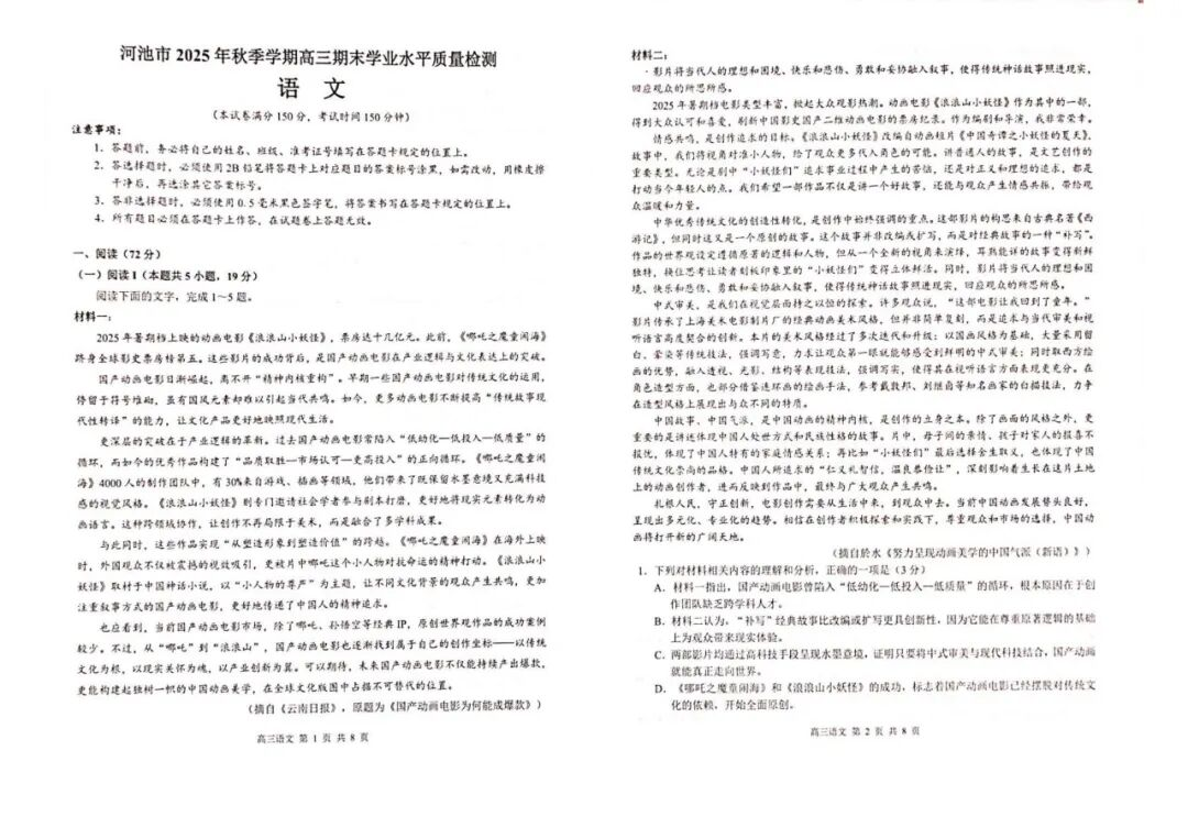【全科】广西河池市2025-2026学年高三上学期期末学业水平质量检测