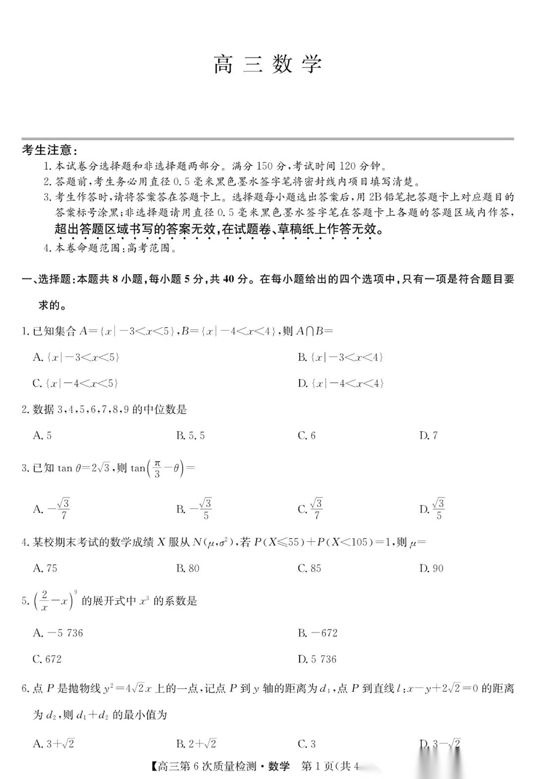 【全科】九师联盟2026届高三第6次质量检测