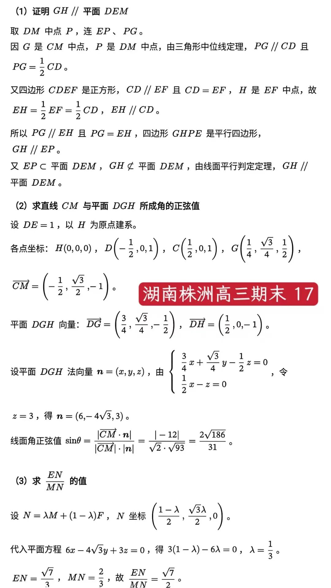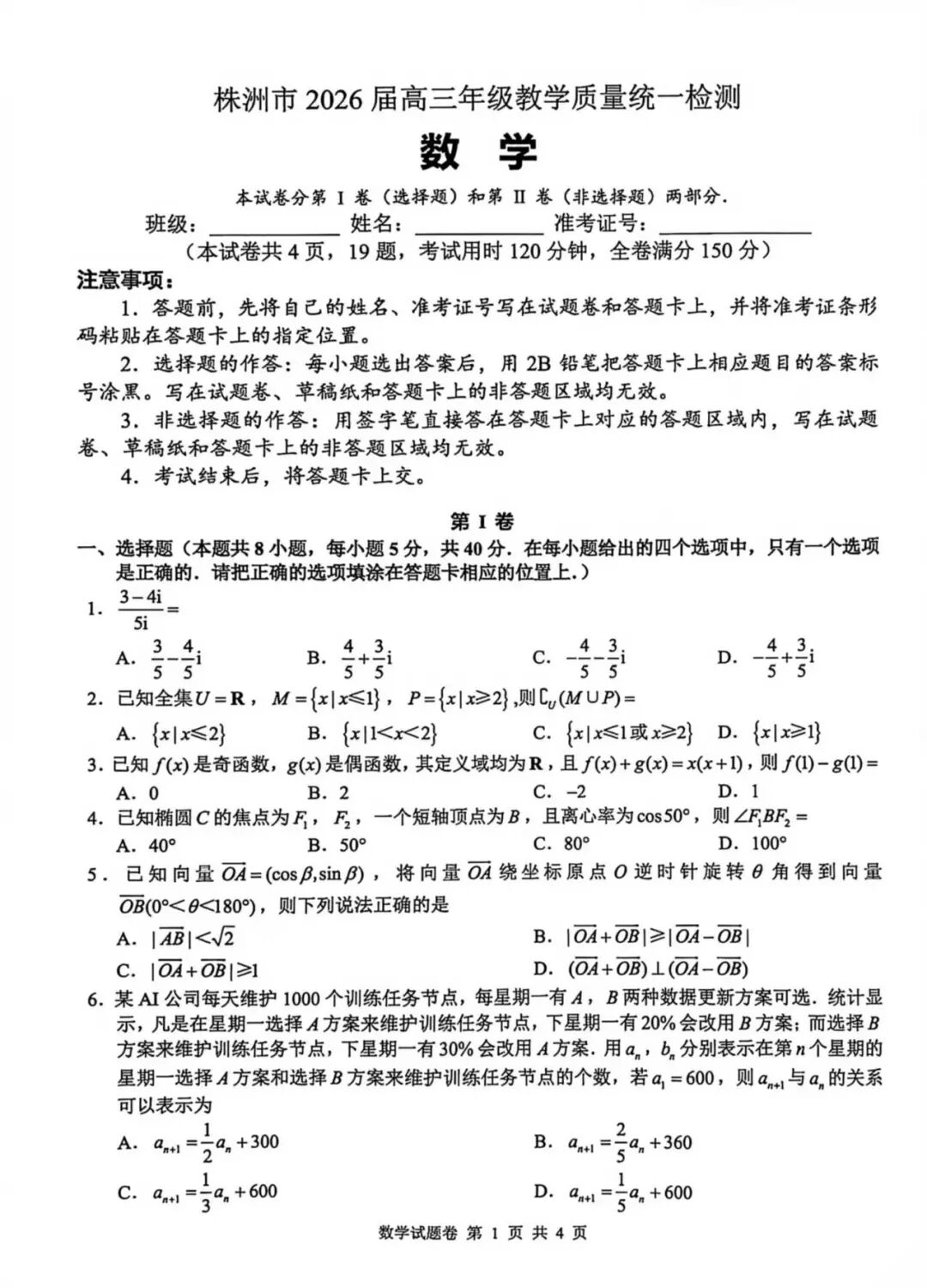 【自做数学】株洲高三一模暨株洲市2026届高三年级教学质量统一检测数学试卷及自做版本答案!仅供参考