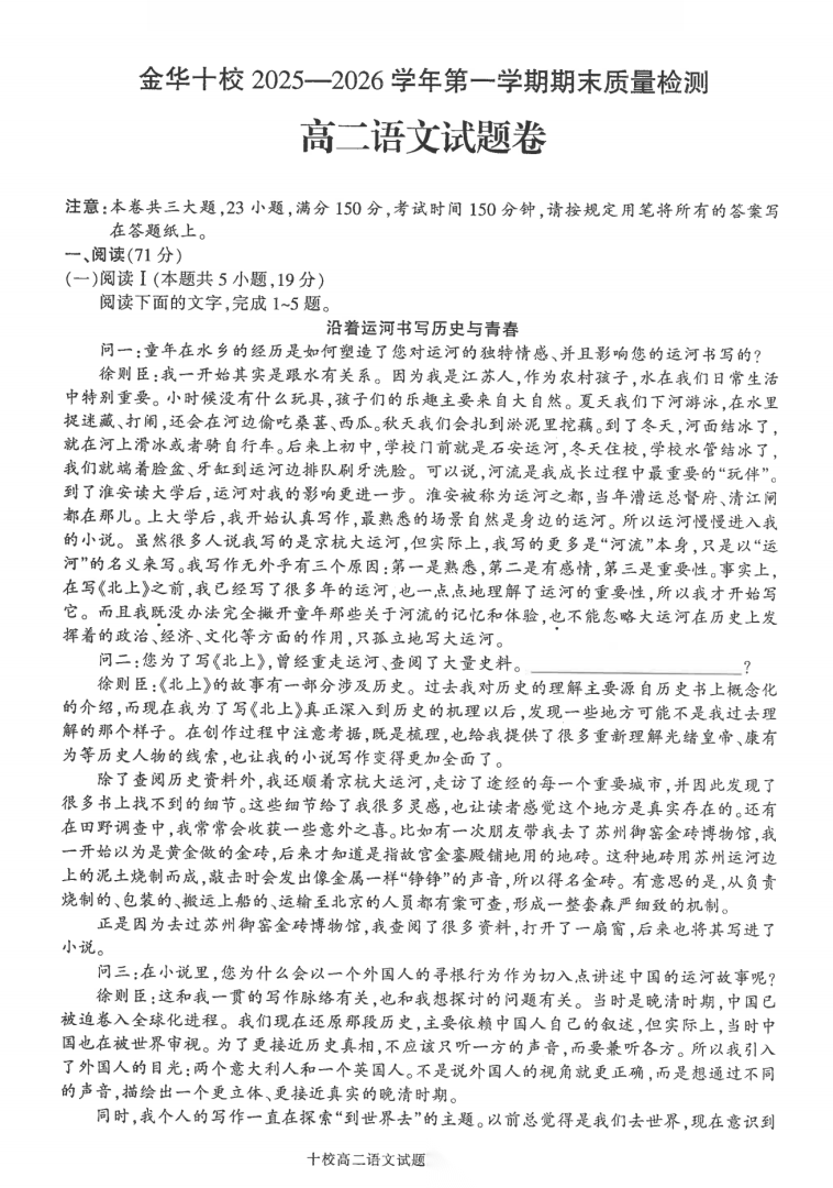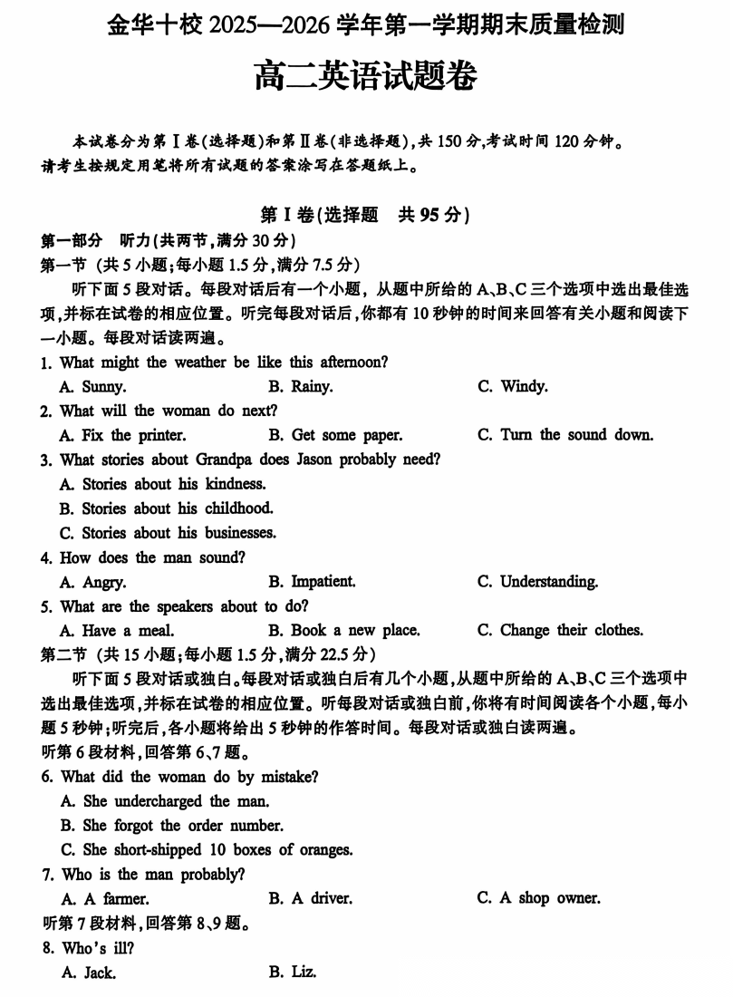 【浙江卷】【高二】浙江省金华十校2025-2026学年第一学期高二上学期2月期末质量检测考试(2.4-2.6) 全科试卷+答案