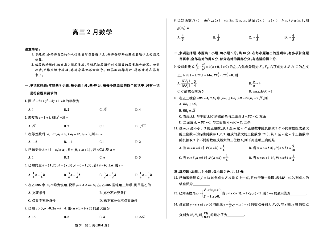 湖北省2026届高三圆创联盟2月联考 湖北省2026届高三圆创联盟2月联考