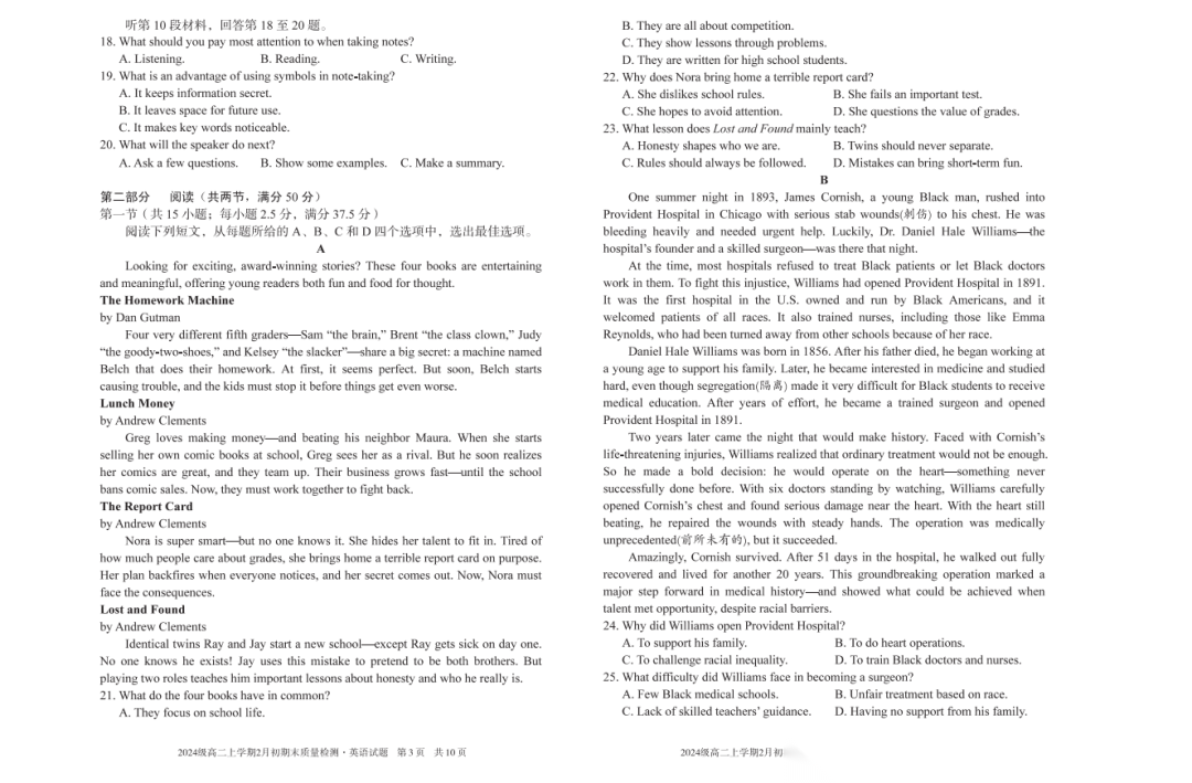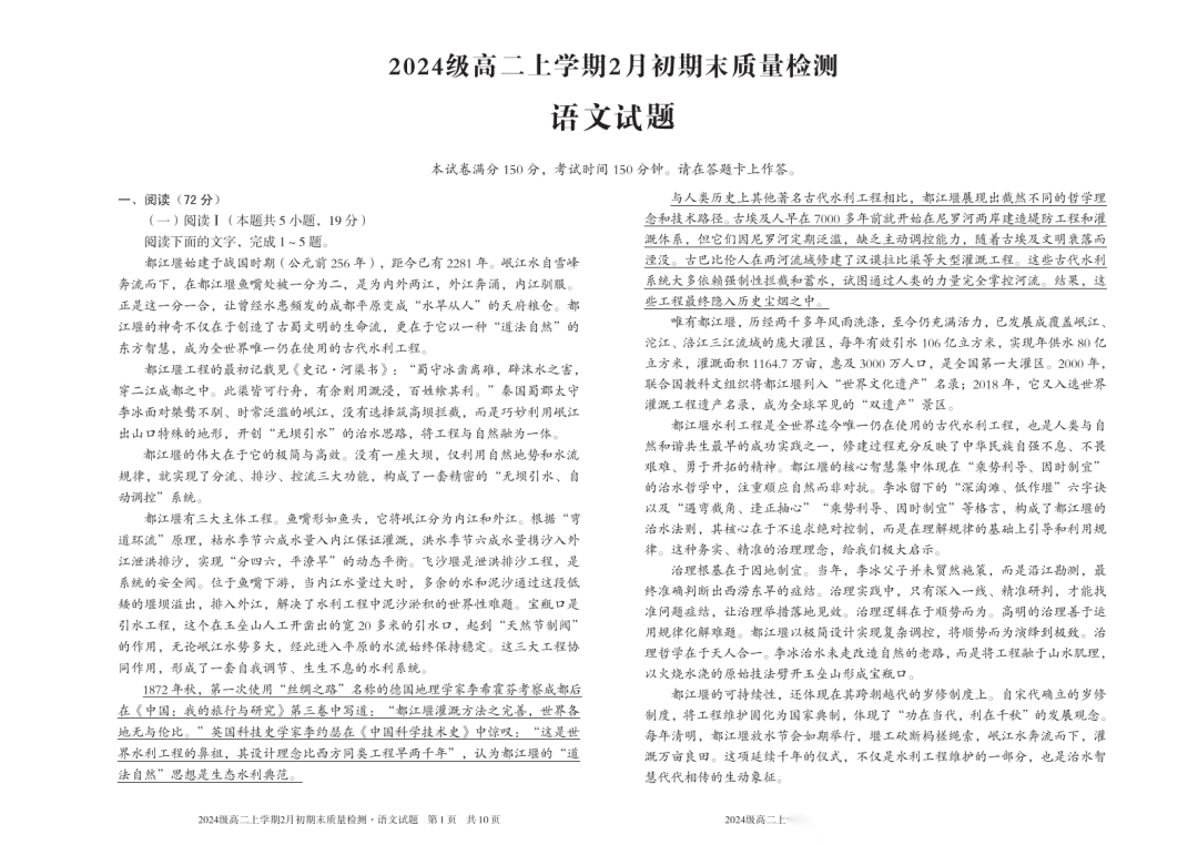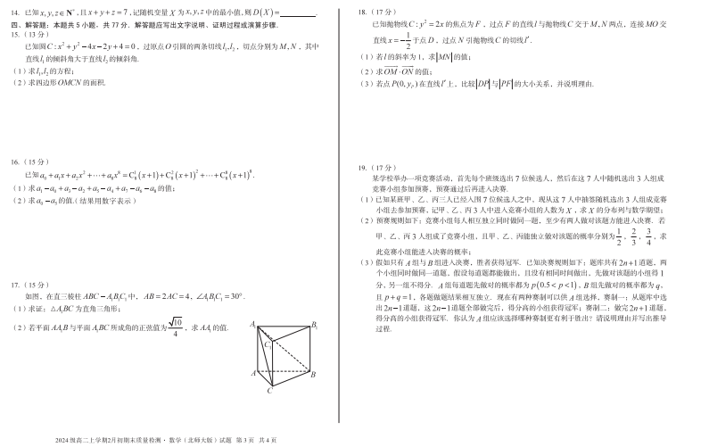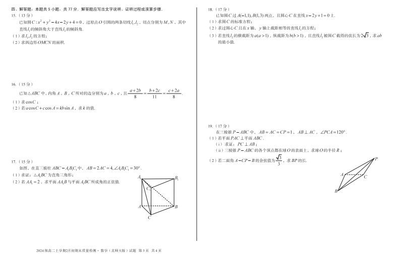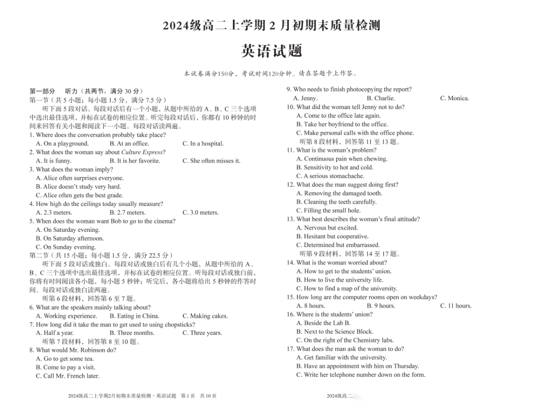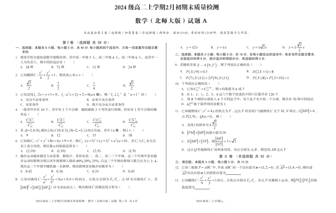 【安徽卷】【高二】安徽省A10联盟2024级(2027届)高二年级上学期2月初期末质量检测(2.3-2.4) 全科试卷+答案