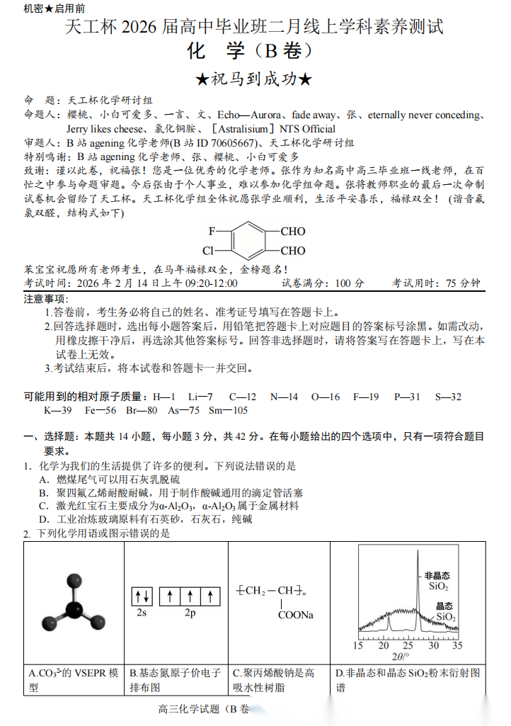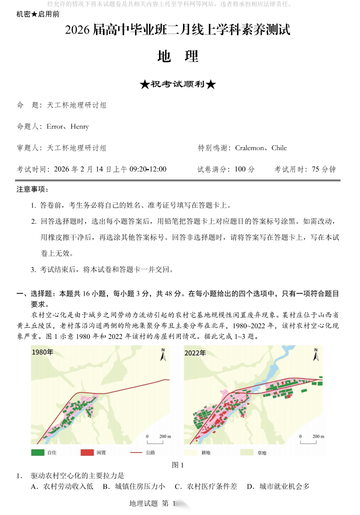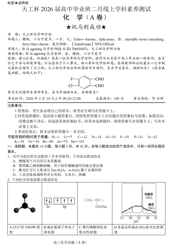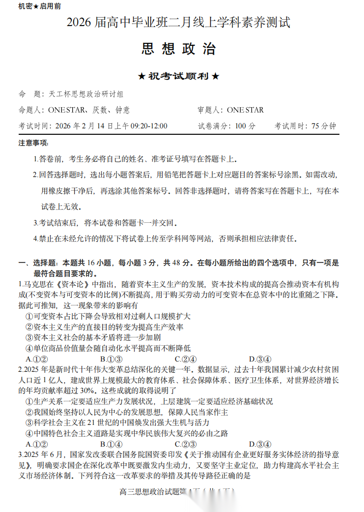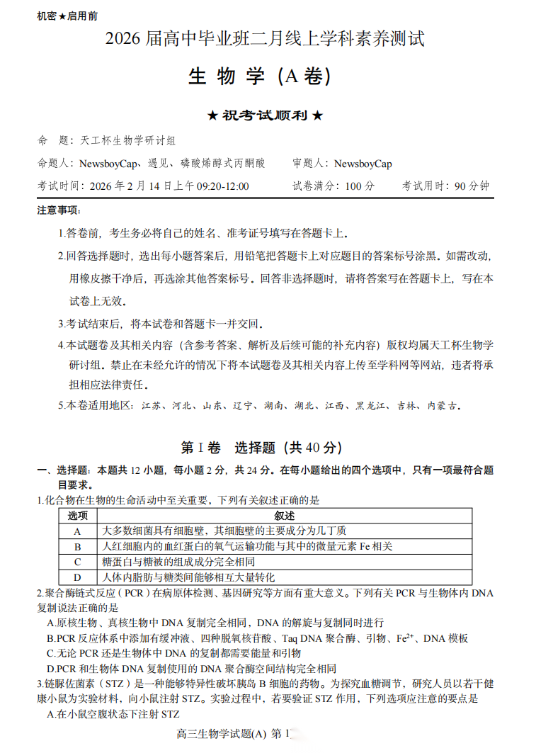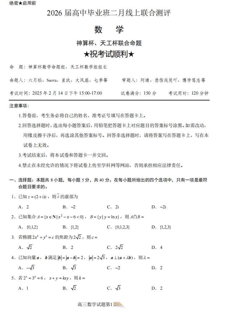 【线上联考】【天工杯赛】【全科目】2026 届高三年级“天工杯”2 月线上学科能力测试(2.13-2.14)全科试题卷+答题卡(2.15公布 答案与解析)