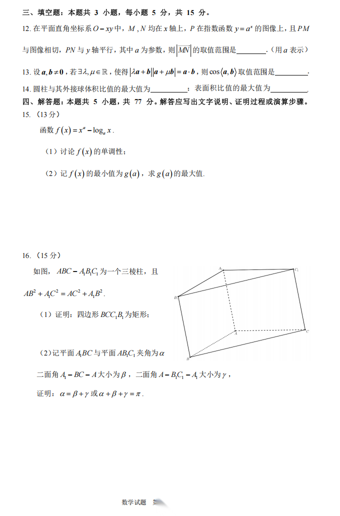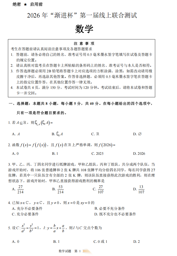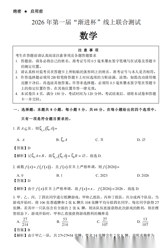 【线上联考】【渐进杯赛】 2026 年“渐进杯”第一届线上联合测试(2月19日9点-11点) 数学试题卷+答题卡+答案+试卷解析