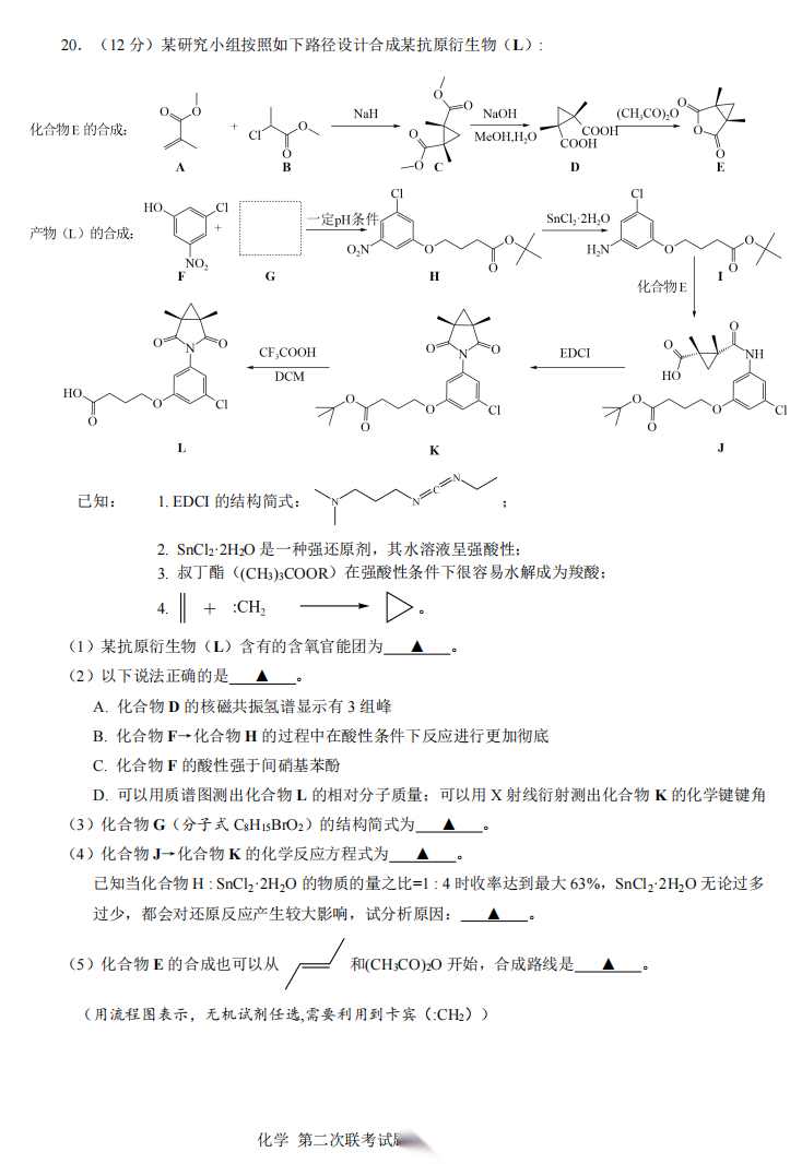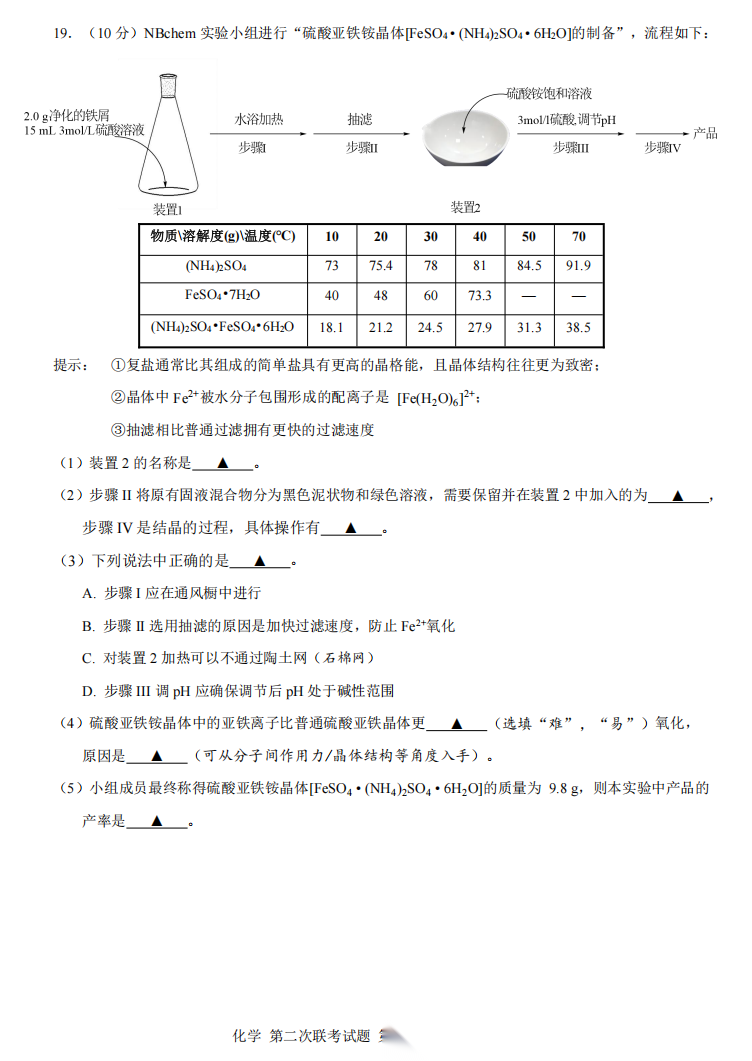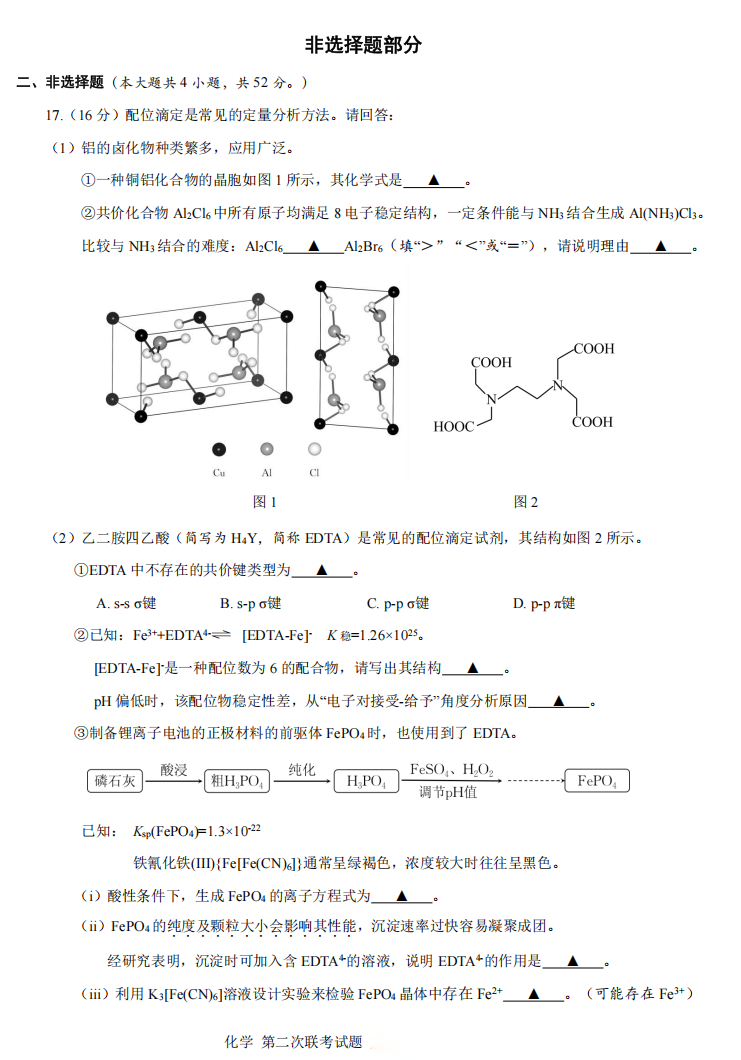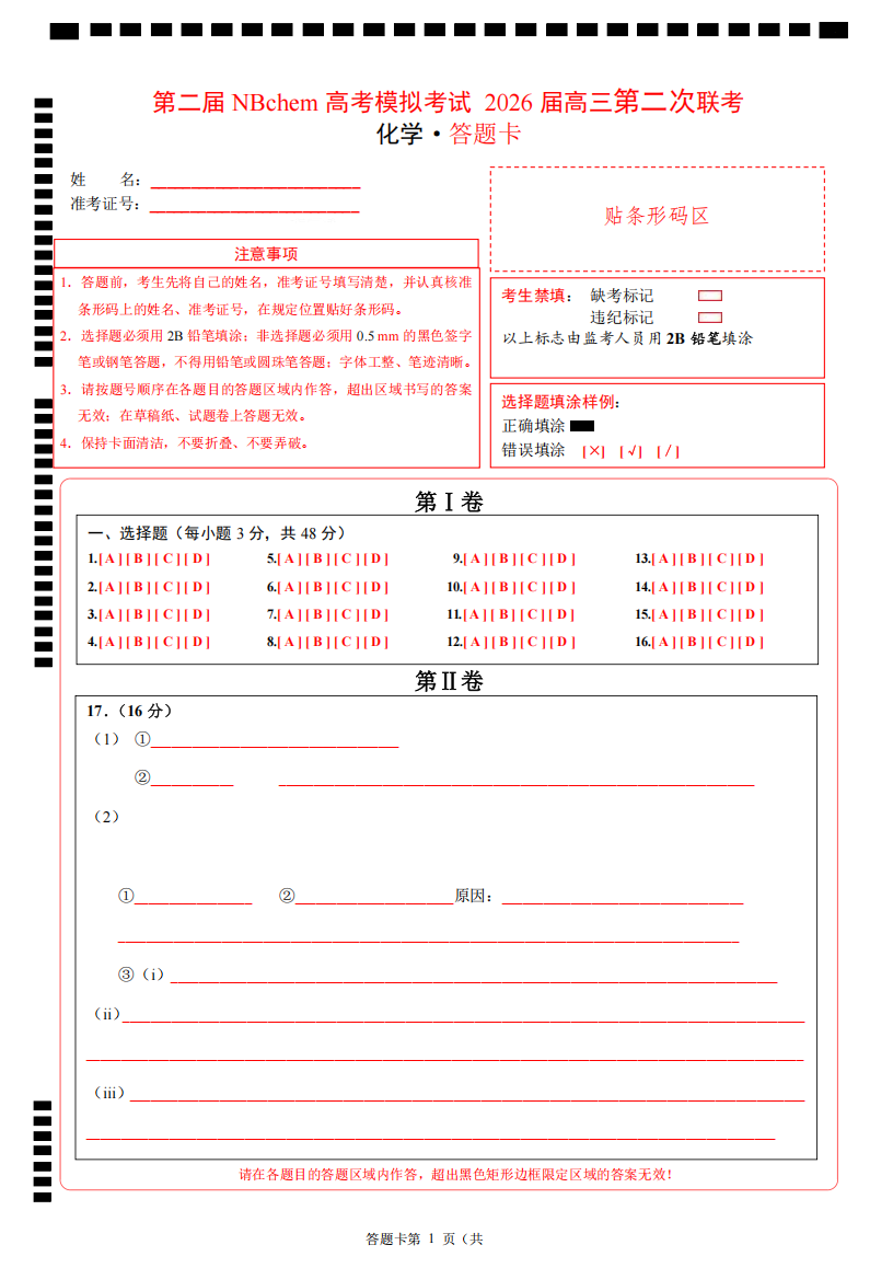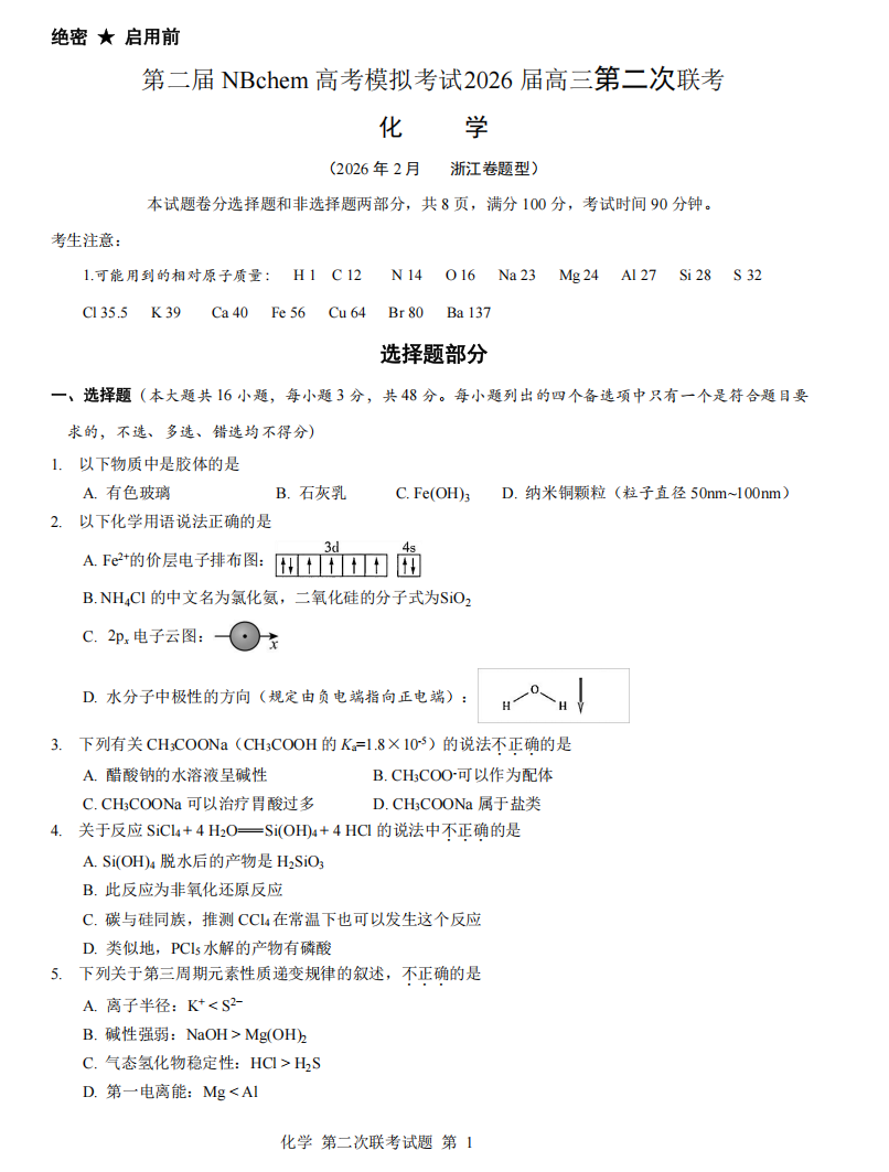 【线上联考】【化学联考】【浙江卷】【NBchem联考】第二届NBchem高考模拟考试2026 届高三第二次联考(2月18日8点-9点15)化学试题卷+答题卡
