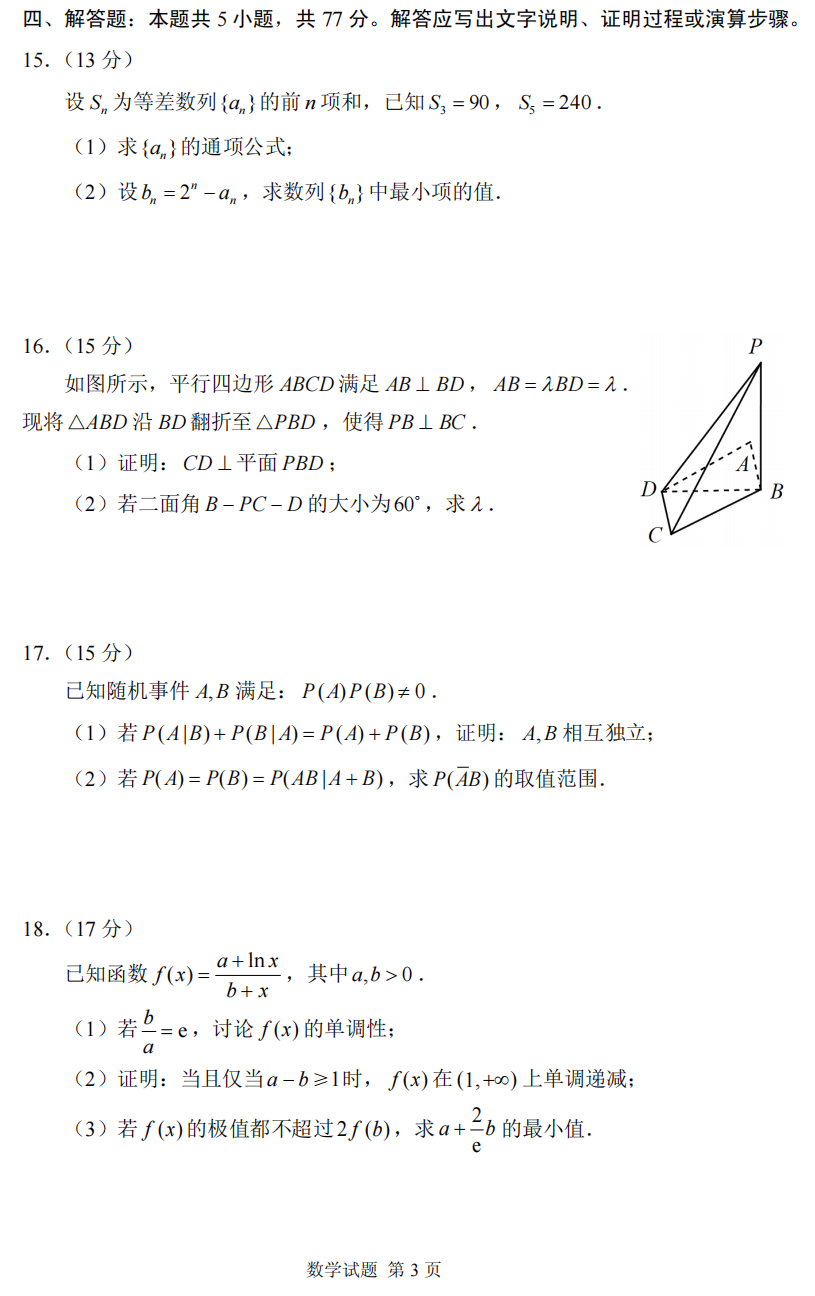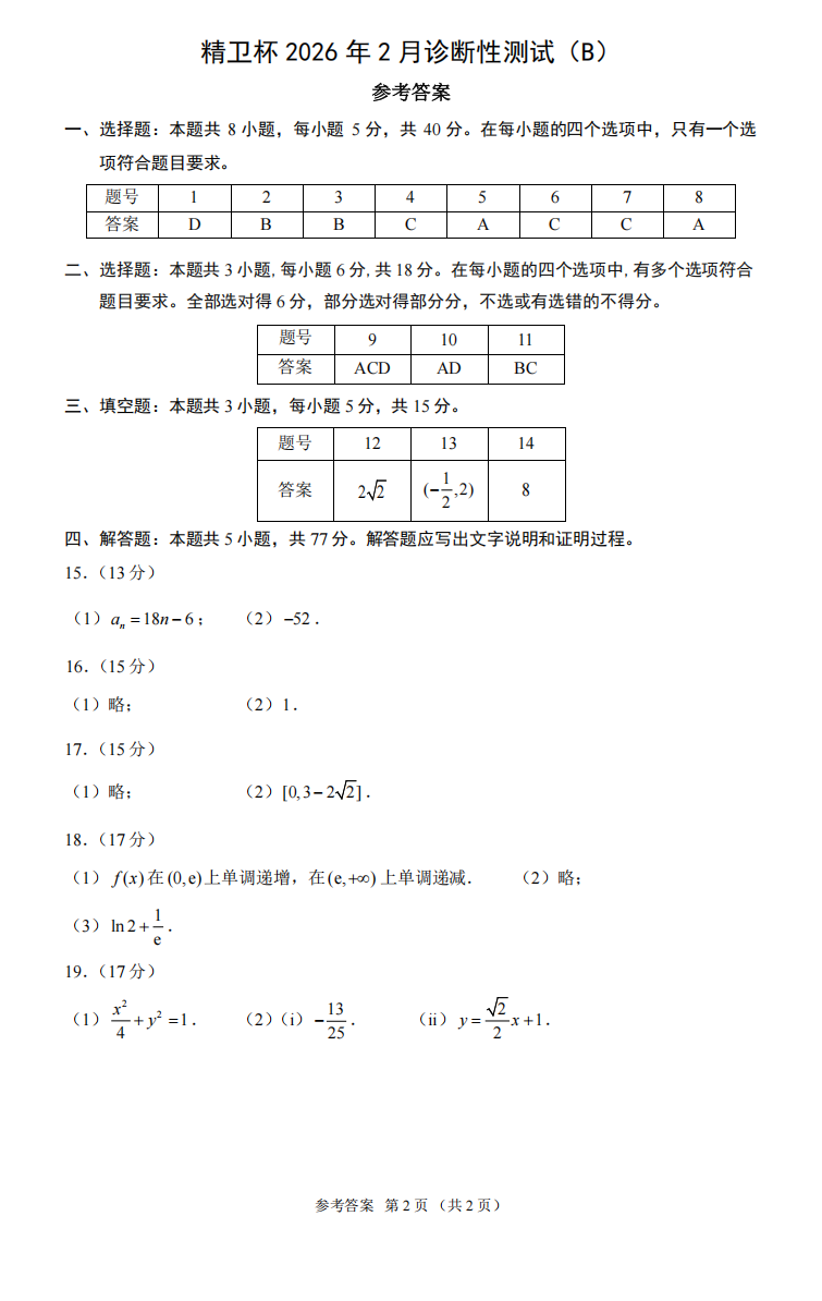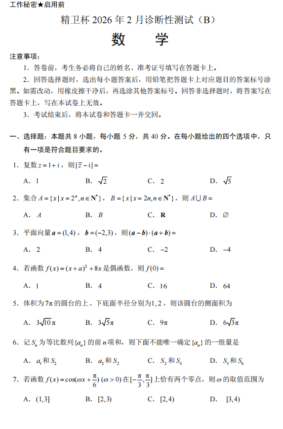 【线上联考】【精卫杯赛】精卫杯2026年2月诊断性测试(B)(2月20日15点-17点) 数学试题卷+答题卡+答案(简答)
