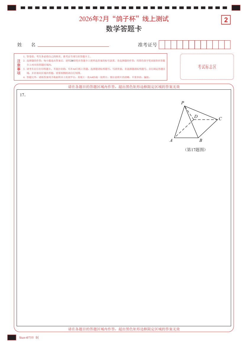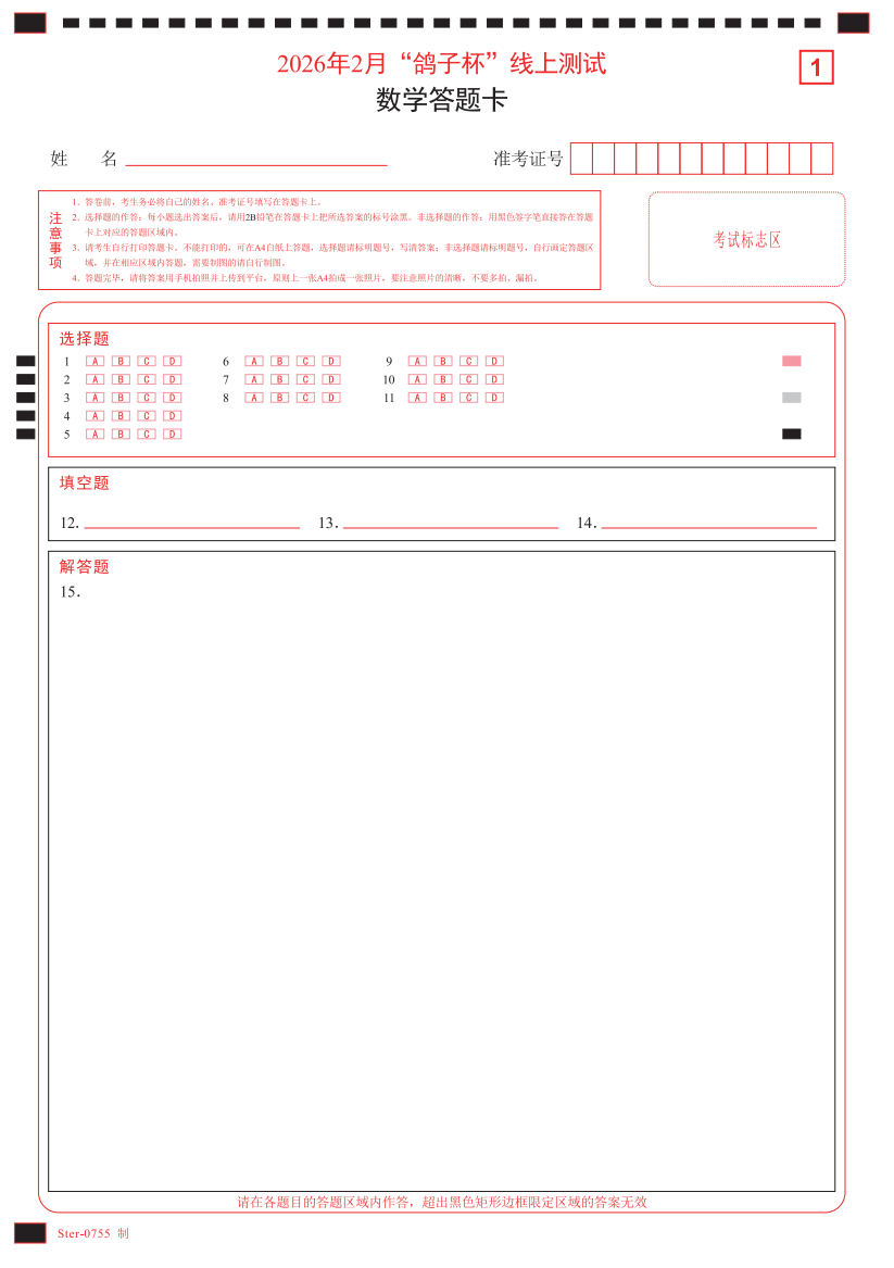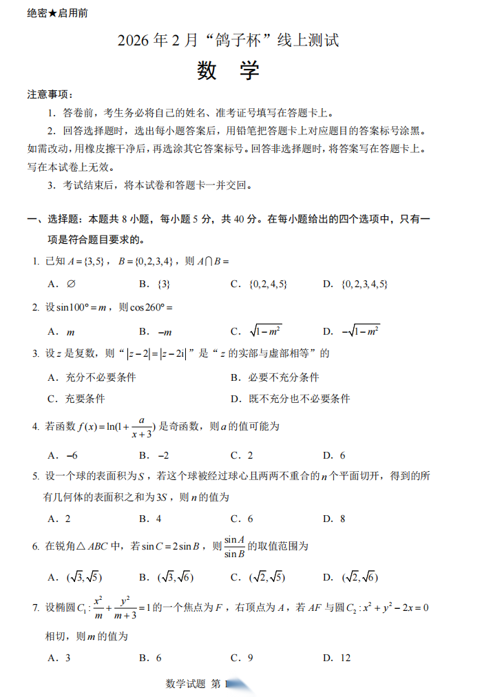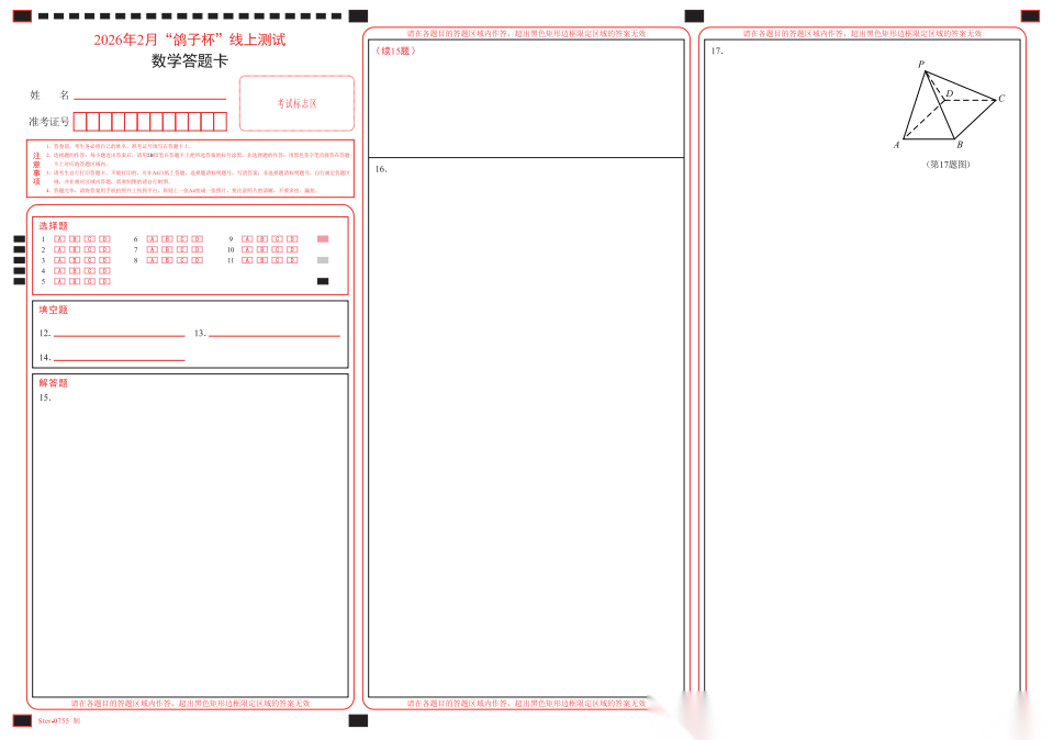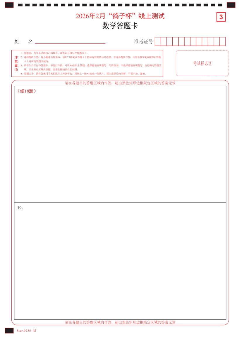 【线上联考】【鸽子杯赛】2026 年2月“鸽子杯”线上测试(2月2日19点-21点) 数学试题卷+答题卡