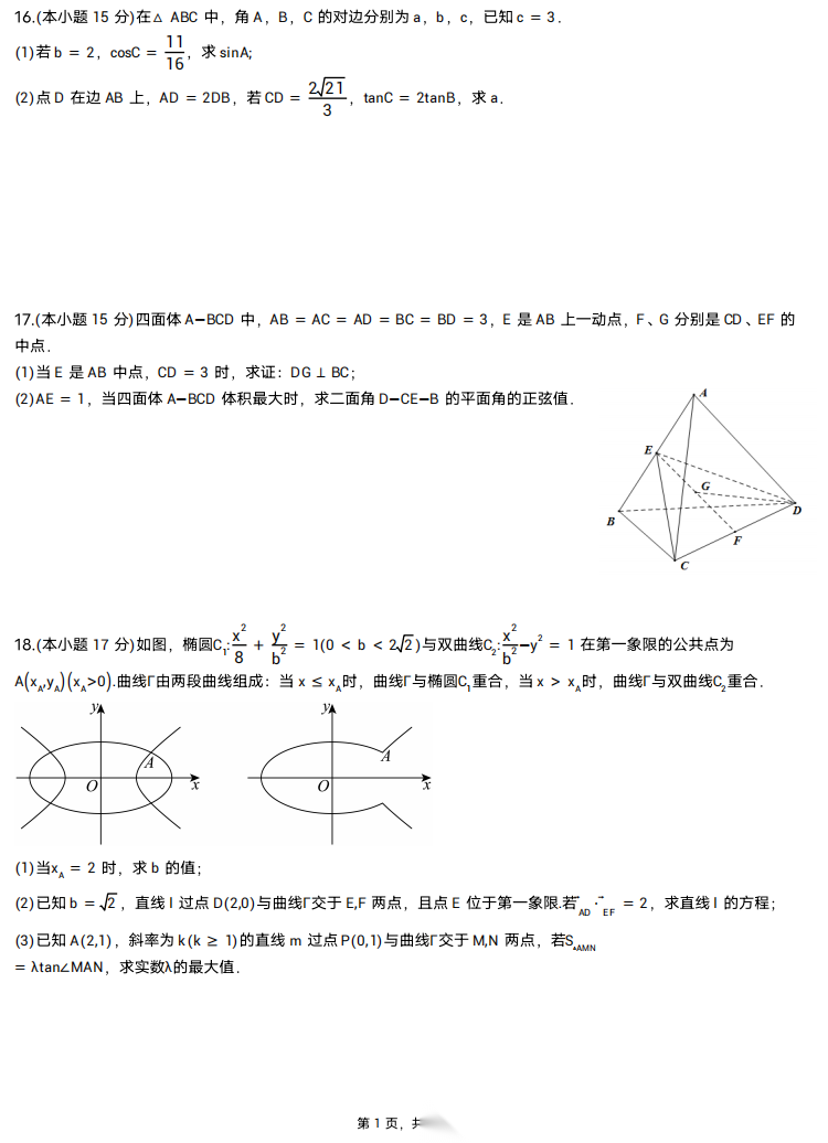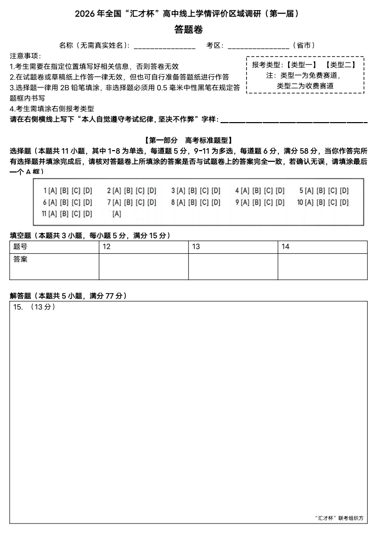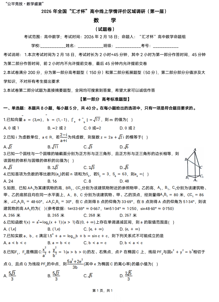 【线上联考】【汇才杯赛】2026 年全国“汇才杯”高中线上学情评价区域调研(第一届))2月18日14点-16点) 数学试题卷+答题卡