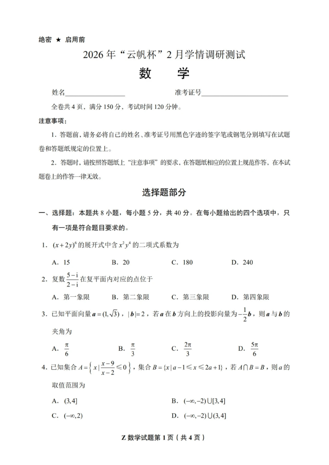 【线上联考】【弈数凌云杯赛】2026 年第一届“弈数·凌云杯”线上联合考试(2月22日15点-17点) 数学试题卷+答题卡+答案 【线上联考】【弈数凌云杯赛】2026 年第一届“弈数·凌云杯”线上联合考试(2月22日15点-17点) ...