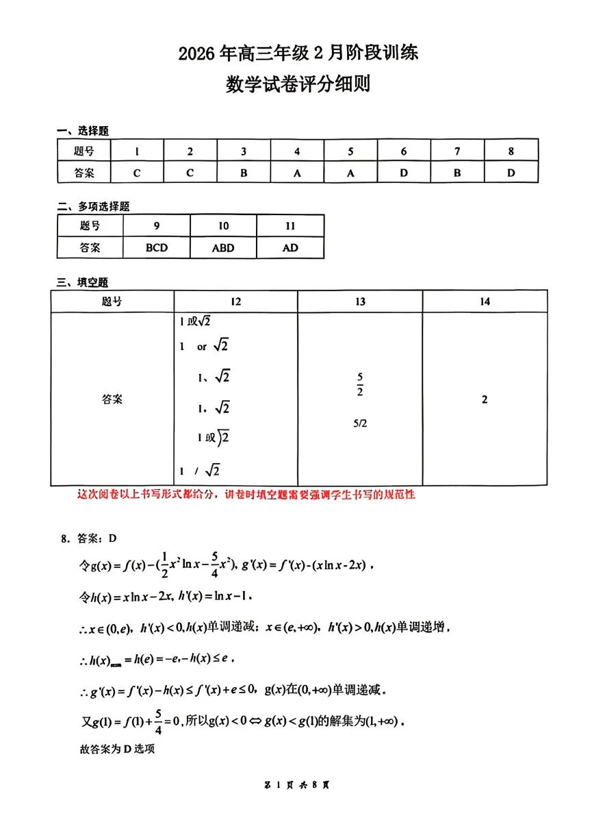 2026届湖北协作体高三2月联考答案 2026届湖北协作体高三2月联考答案