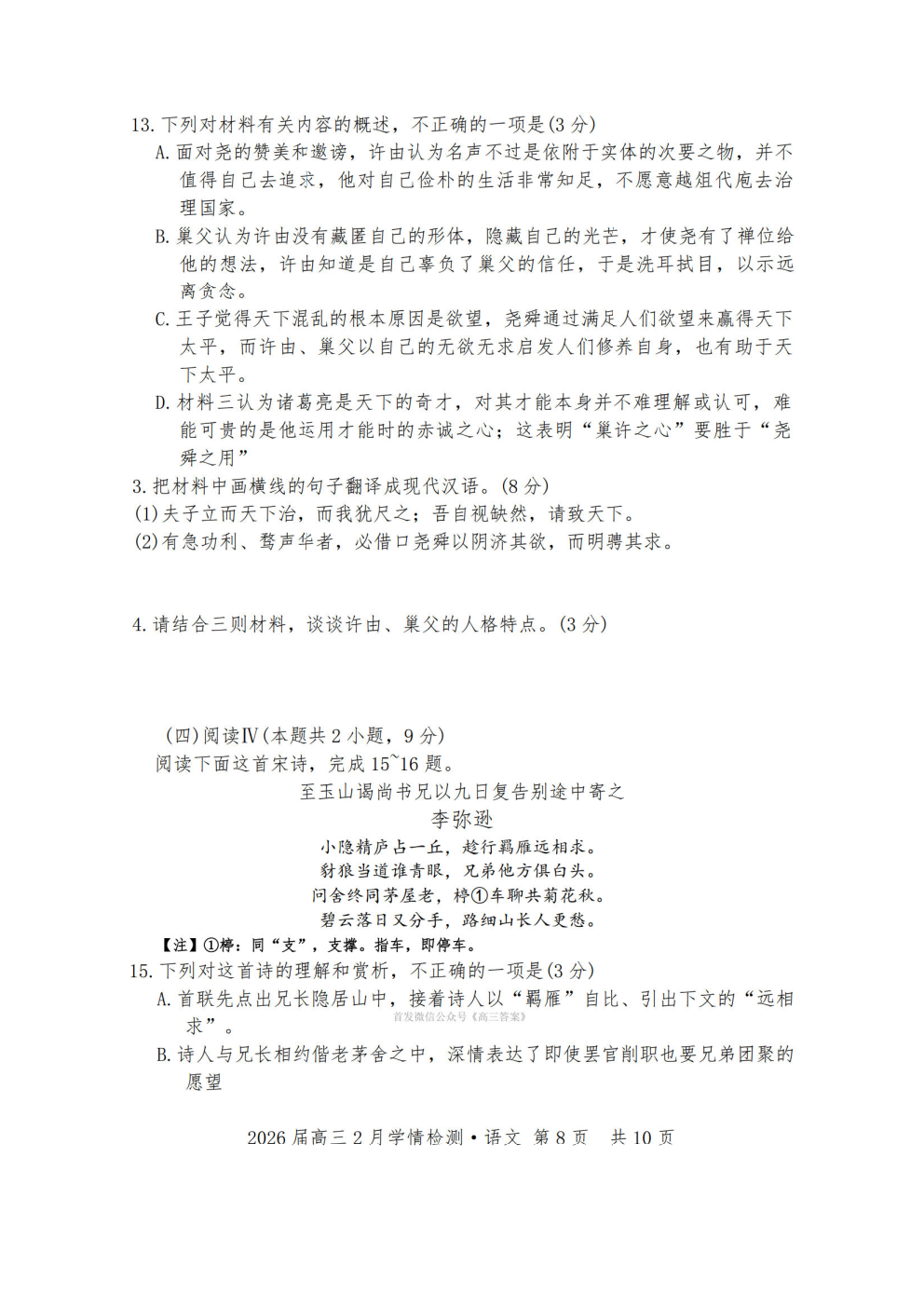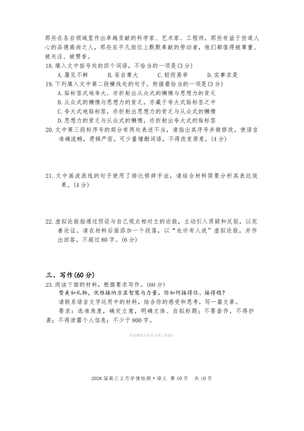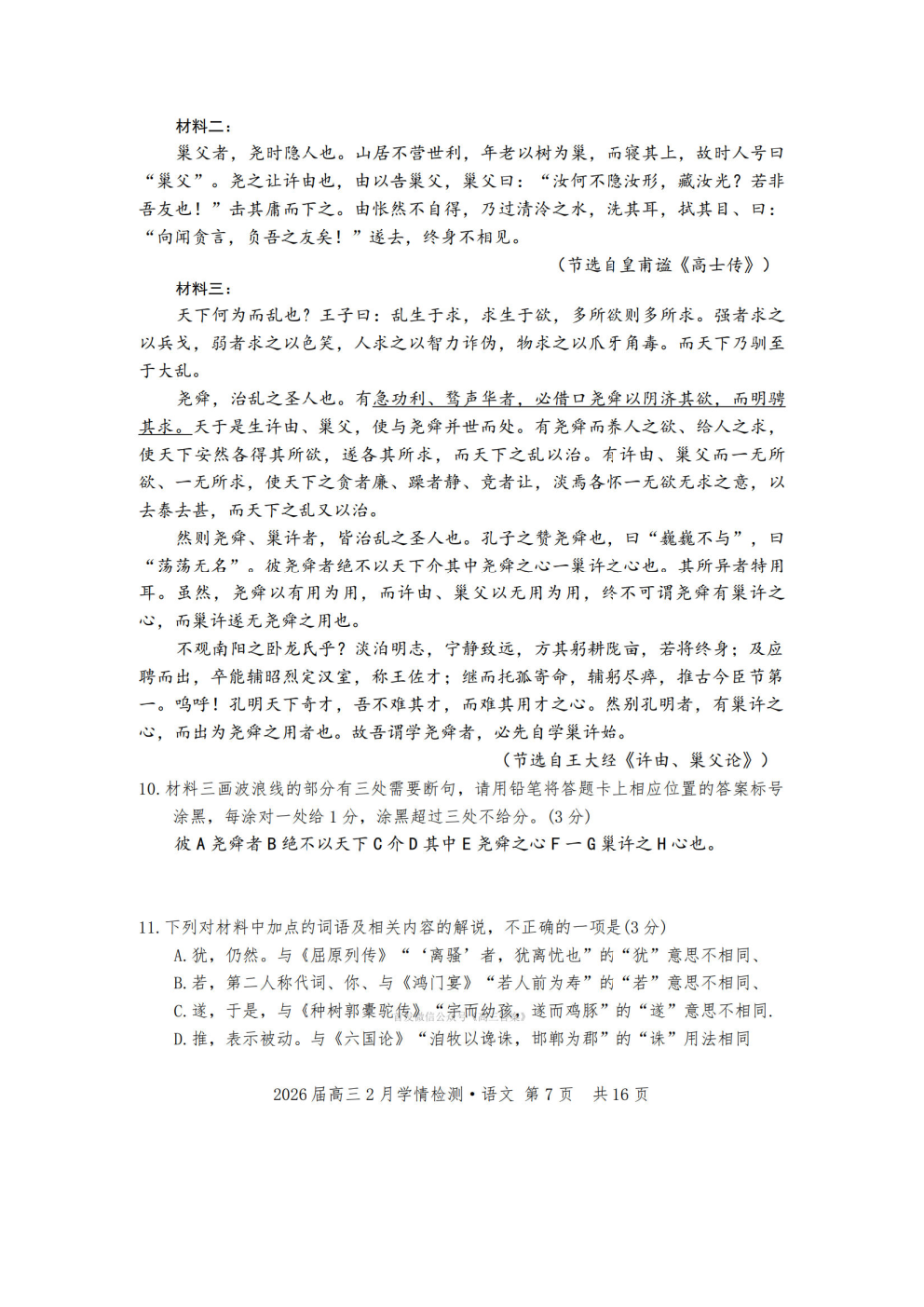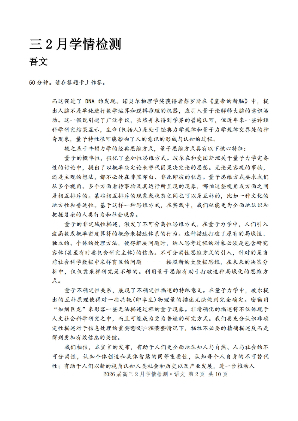 2026年湖北省高三2月检测试卷 2026年湖北省高三2月检测试卷
