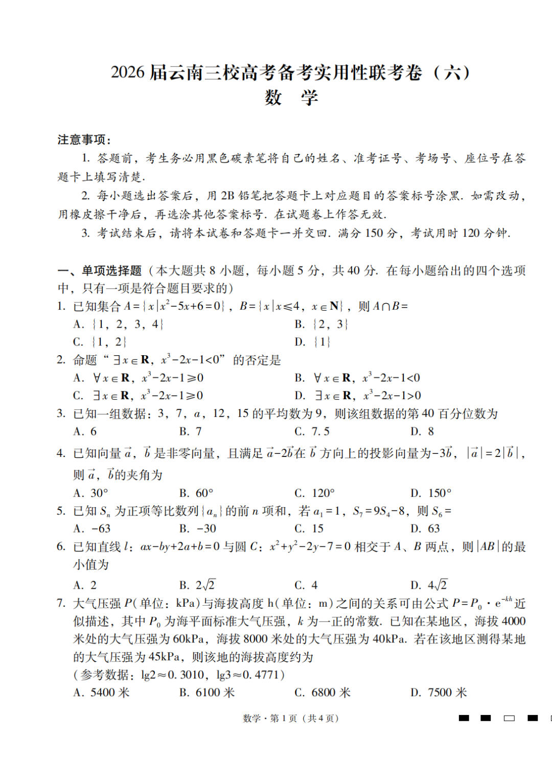 【全科】2026届云南省三校高考备考实用性联考卷(六)