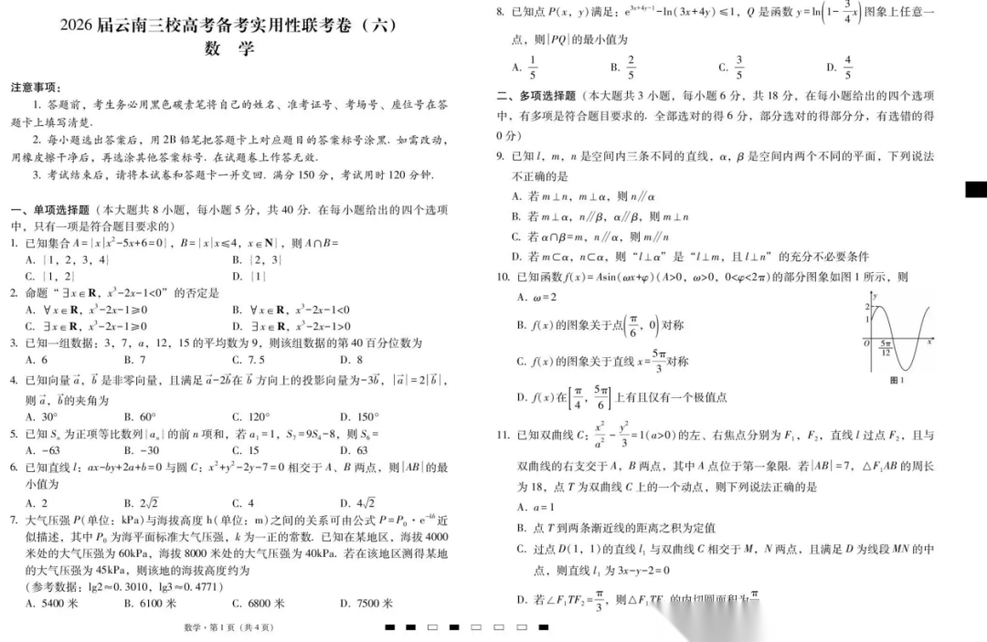 【云南卷】云南省2026届云南三校高考备考实用性联考卷(六)(2.25-2.26) 全科试题卷+答案