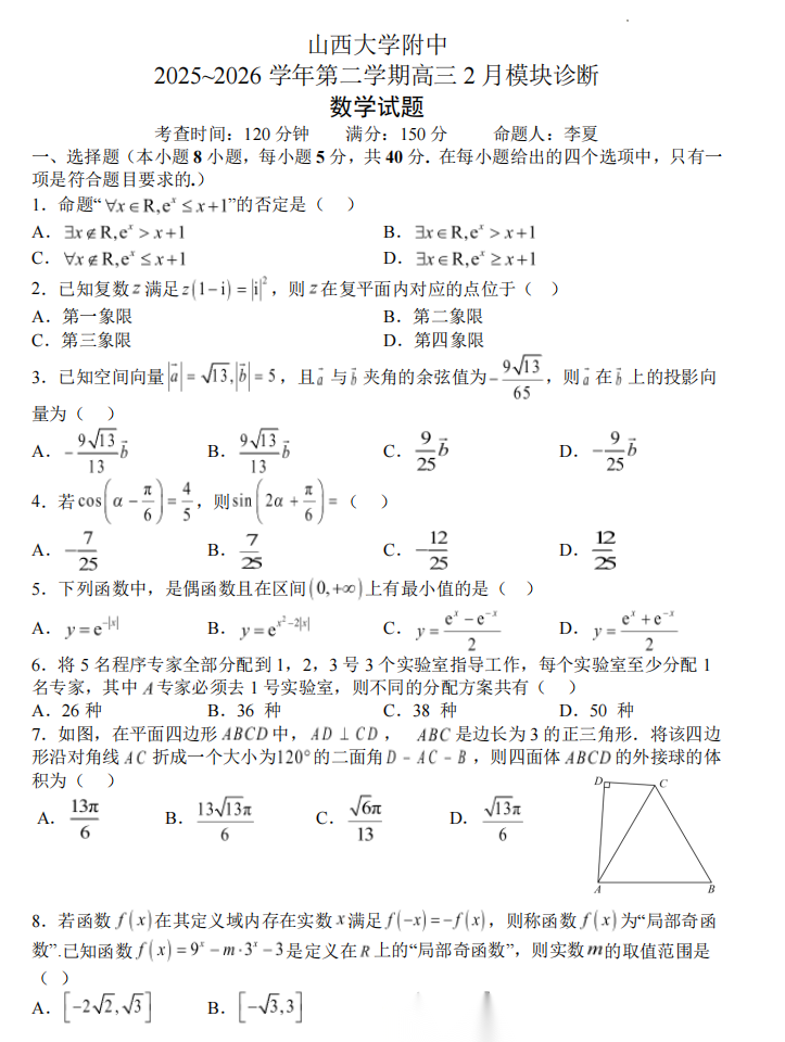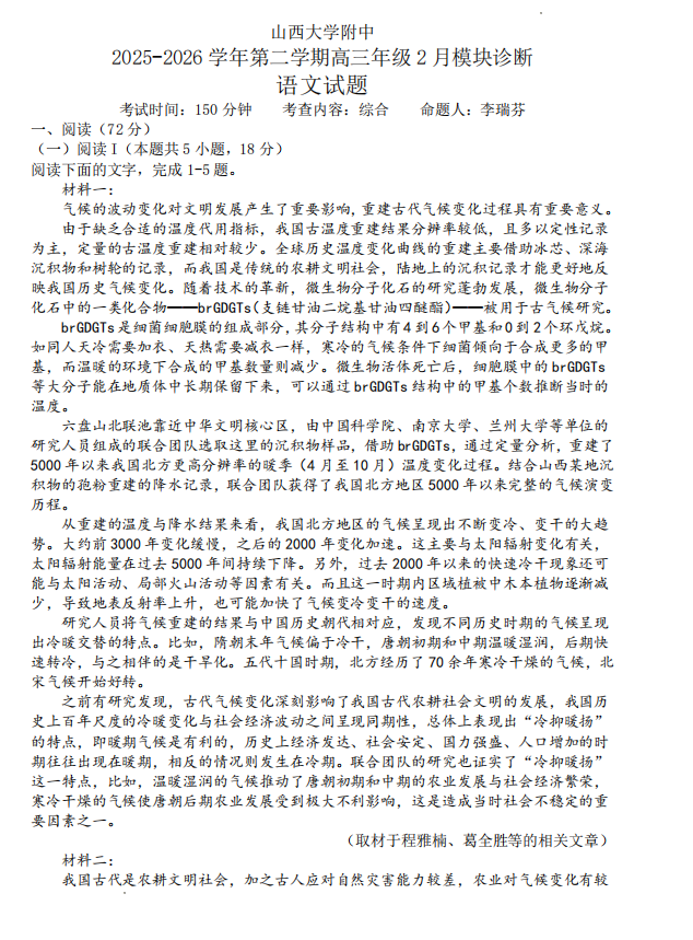 【Top30强校】【西北卷】【山西卷】山西大学附中2025~2026学年第二学期高三年级2月模块诊断暨开学考试(2.23-2.24)全科试题卷+答案