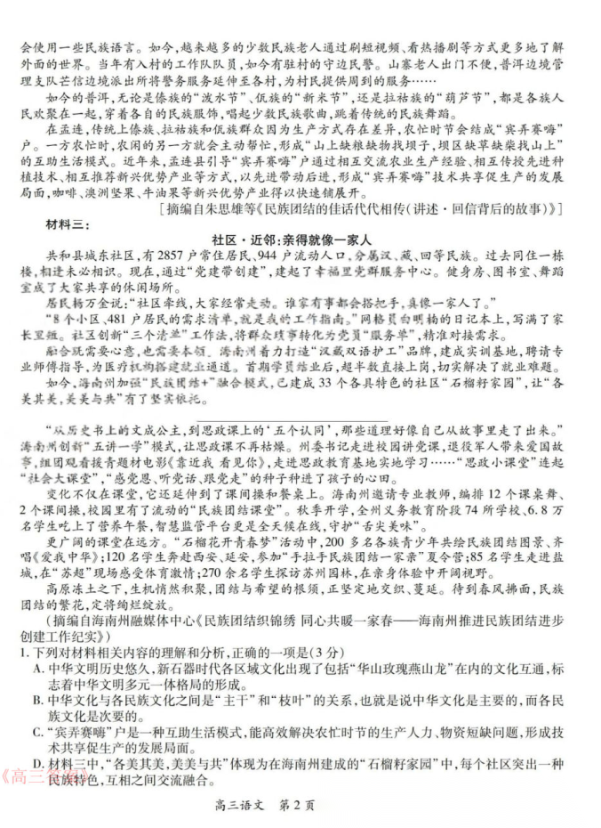 2026届九师联盟高三3月质量检测答案 2026届九师联盟高三3月质量检测答案
