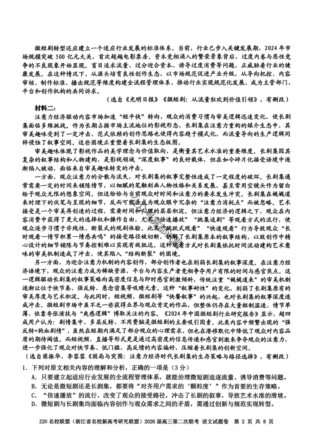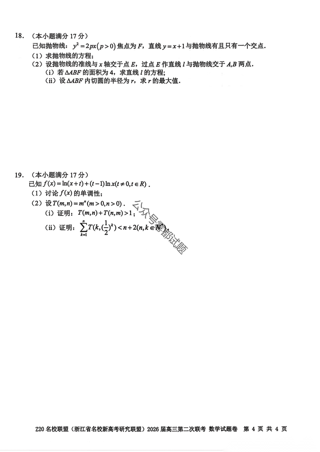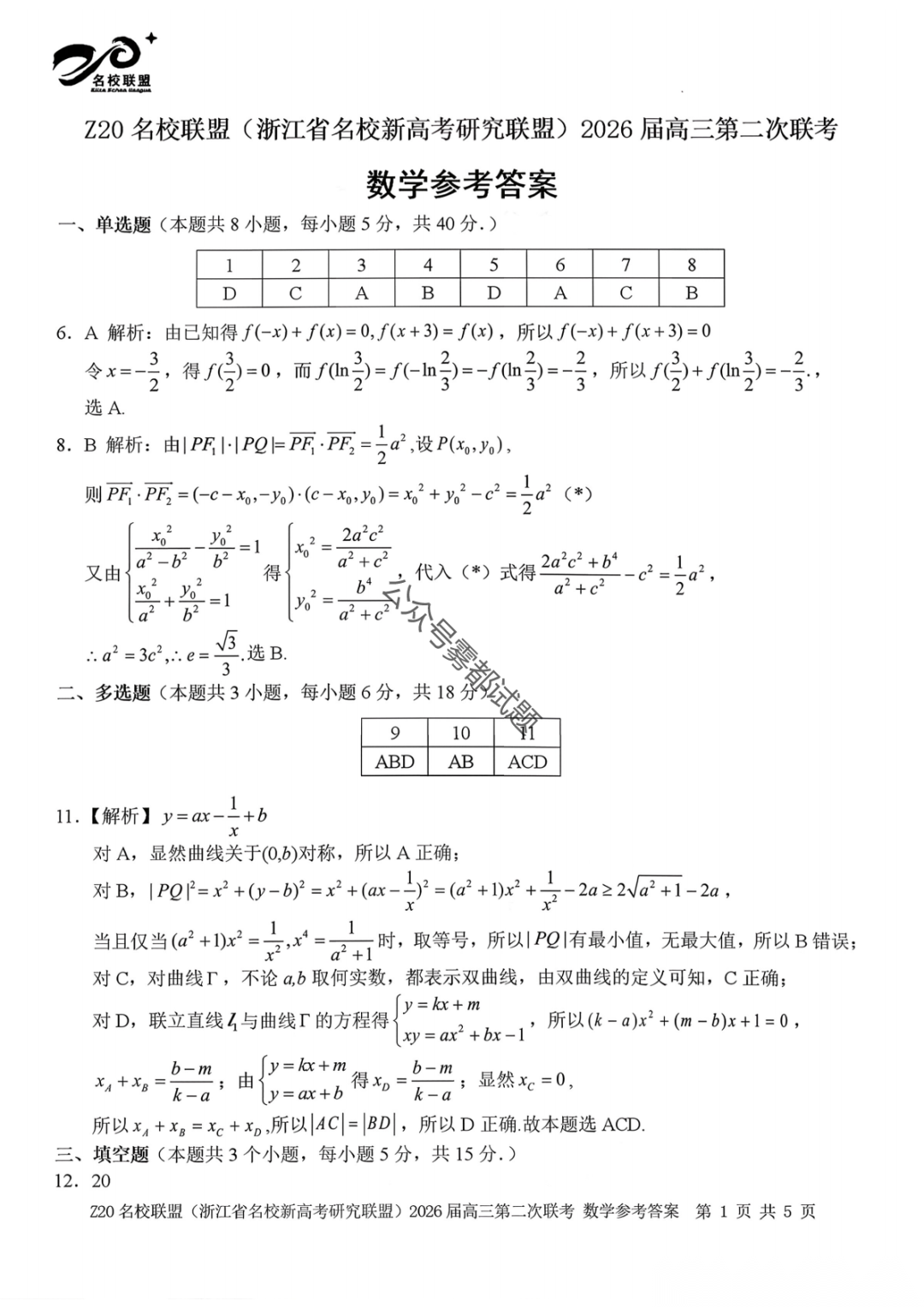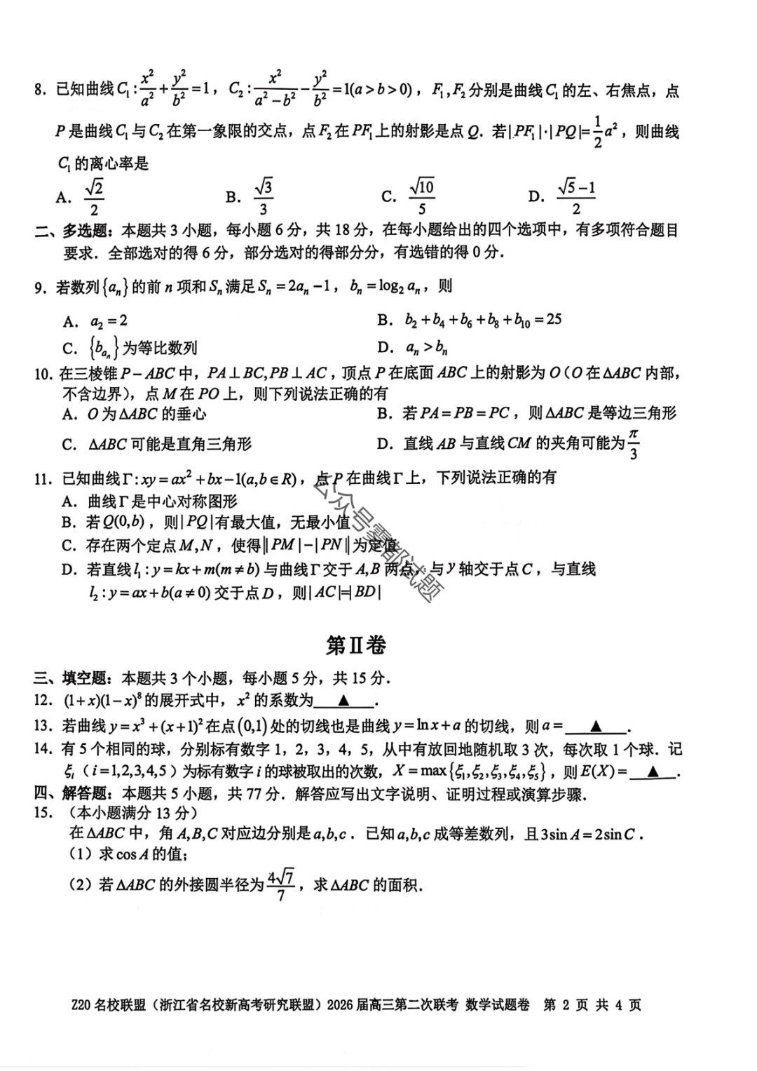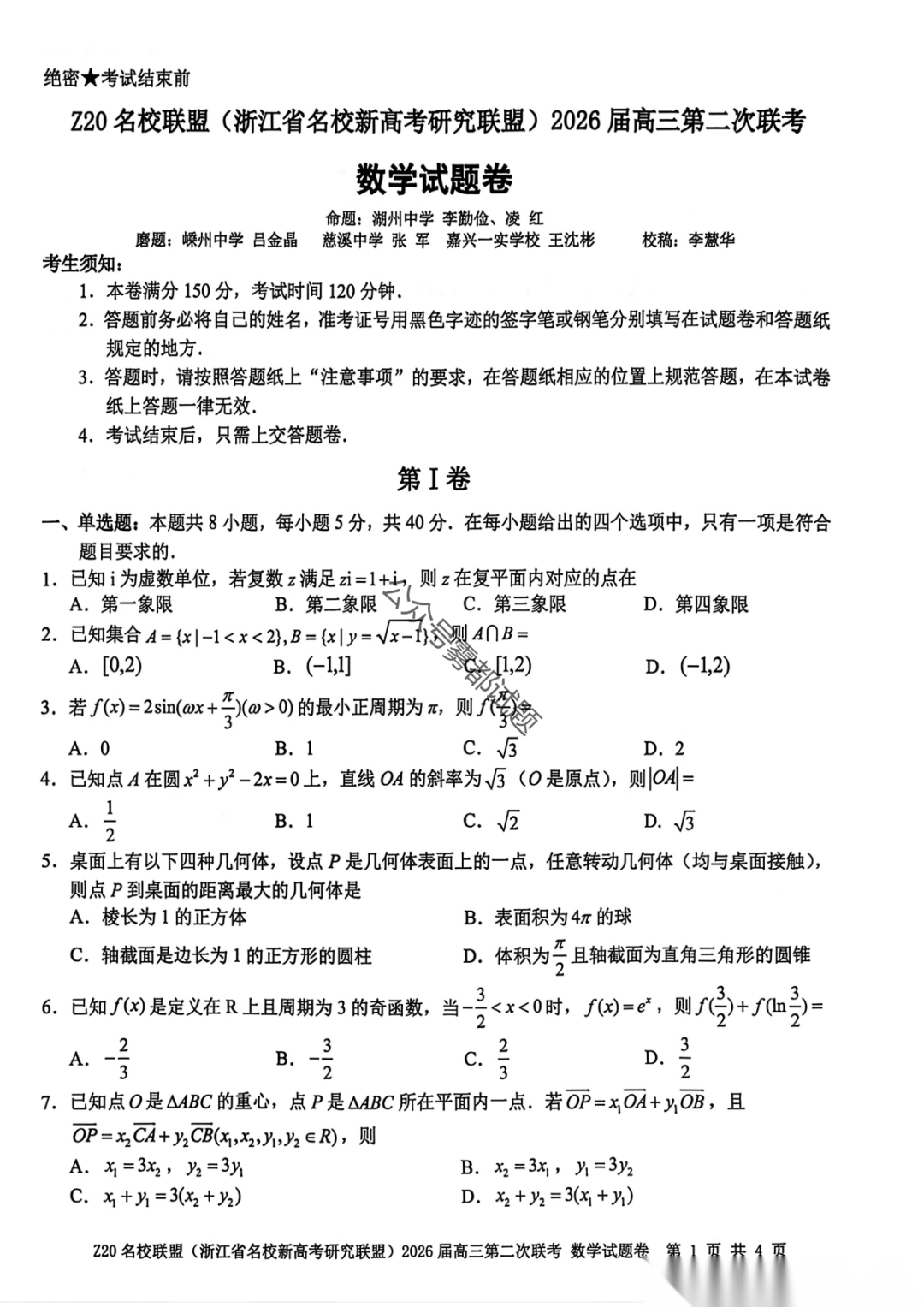 【补充语文数学】Z20名校联盟(浙江省名校新高考卷研究联盟)2026届高三第二次联考
