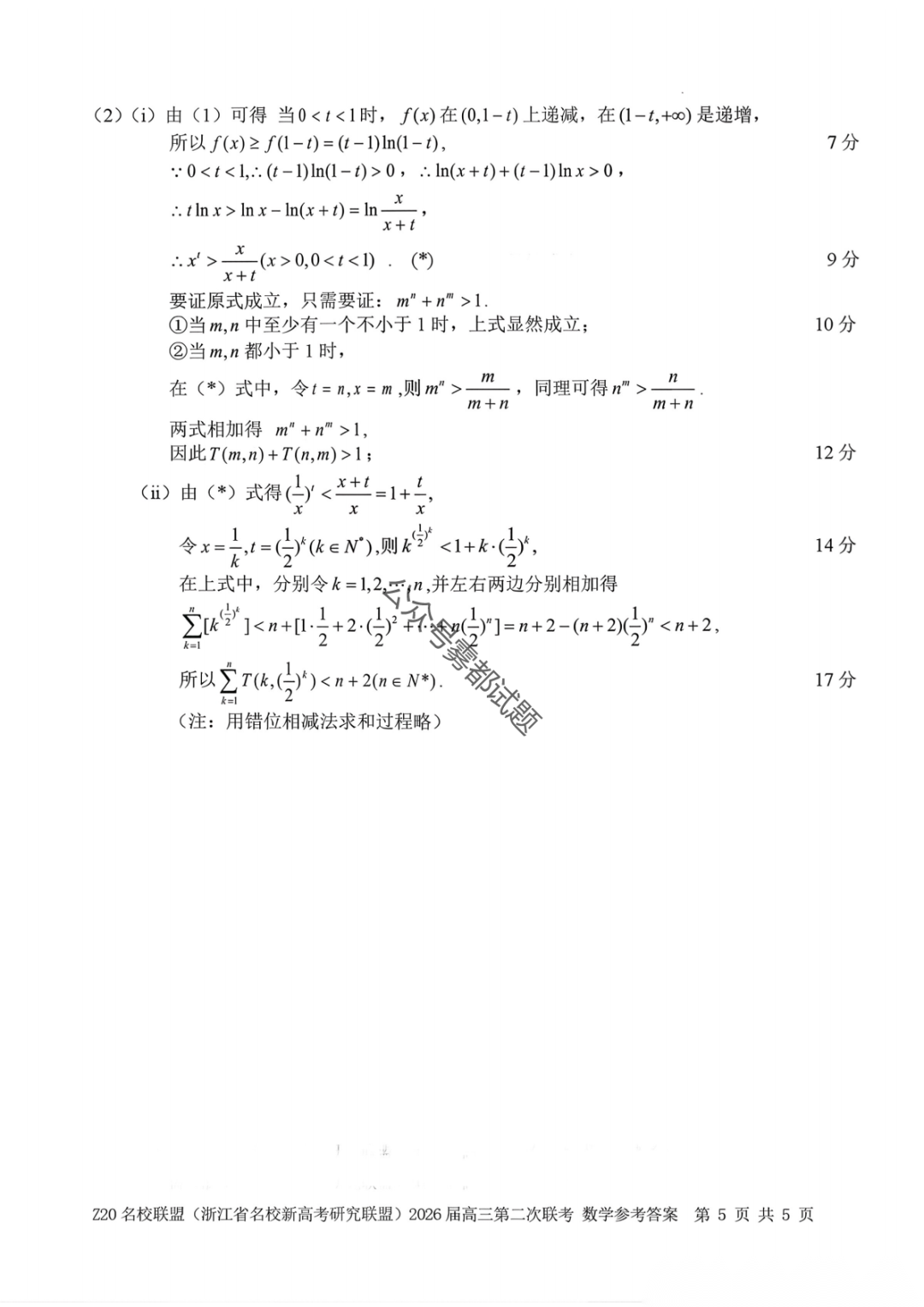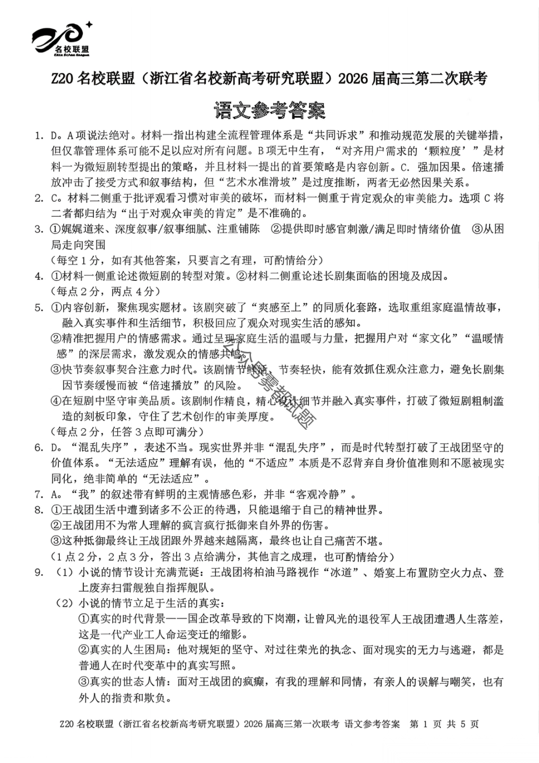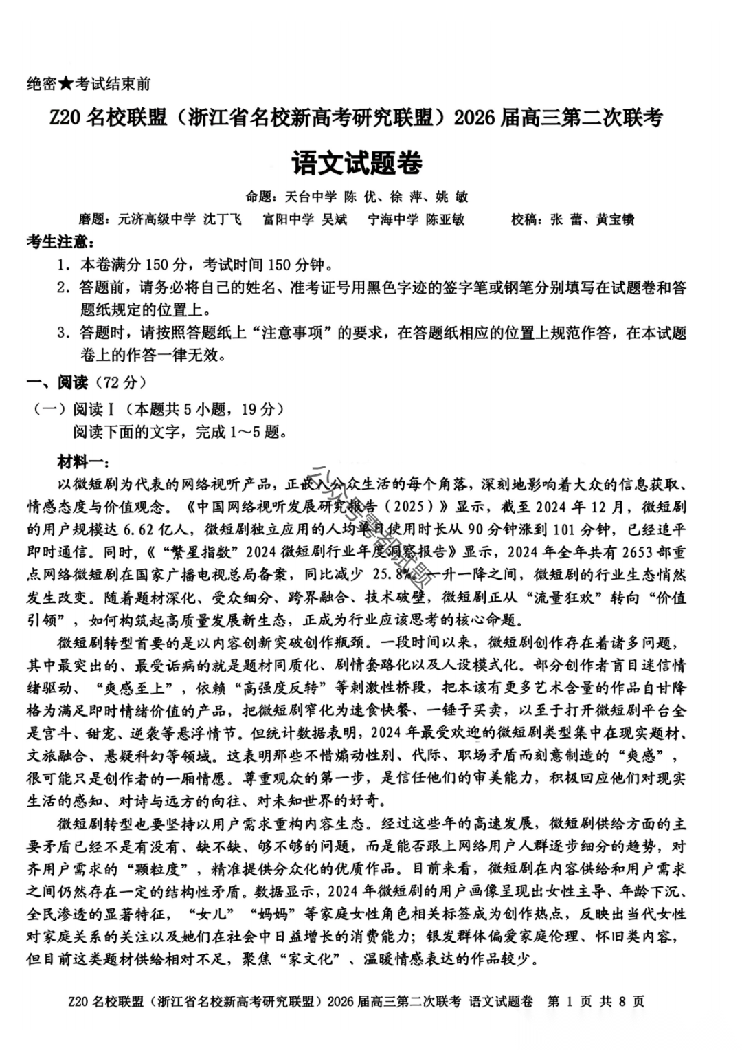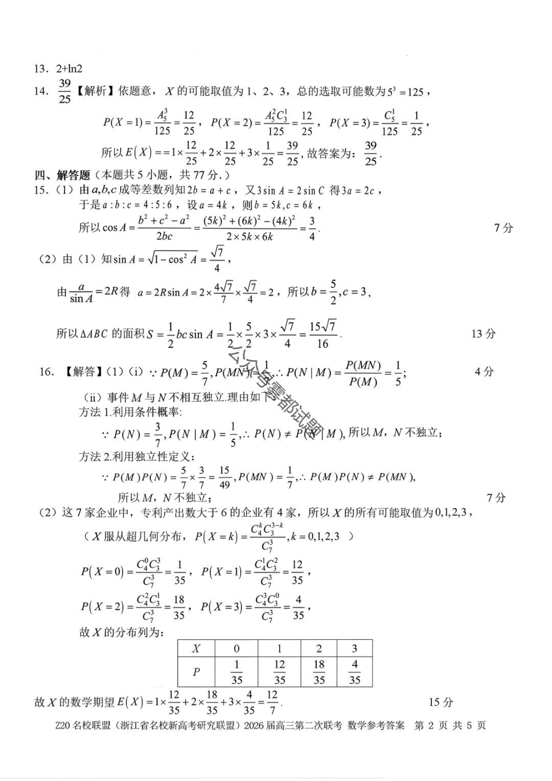 【补充语文数学】Z20名校联盟(浙江省名校新高考卷研究联盟)2026届高三第二次联考