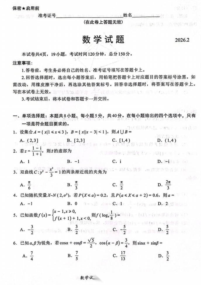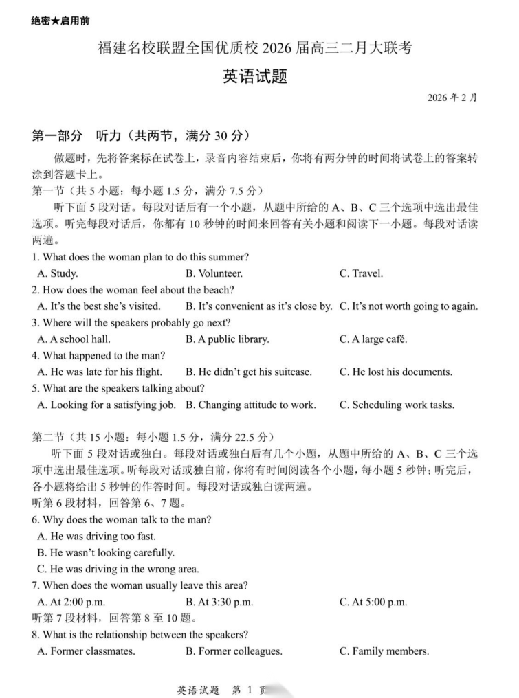 【全科】福建省名校联盟2026届高三2月联考 【全科】福建省名校联盟2026届高三2月联考