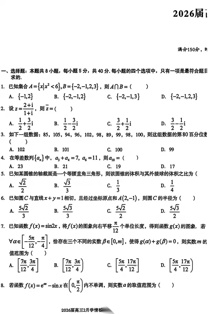 【补齐重发】【安徽卷】安徽省A10联盟2026届高三年级下学期2月学期检测暨开学考试(2.26-2.27) 全科试卷+答案