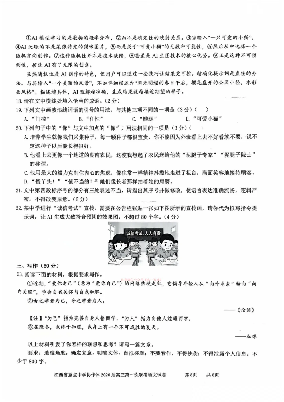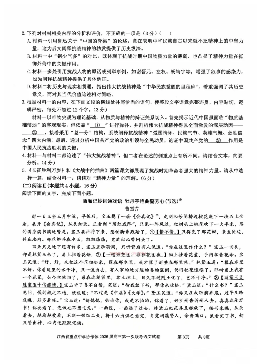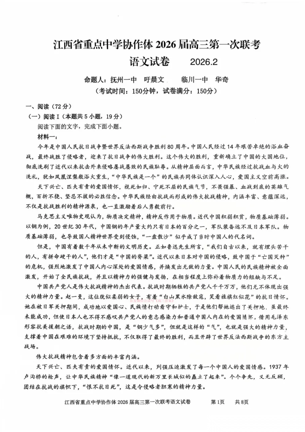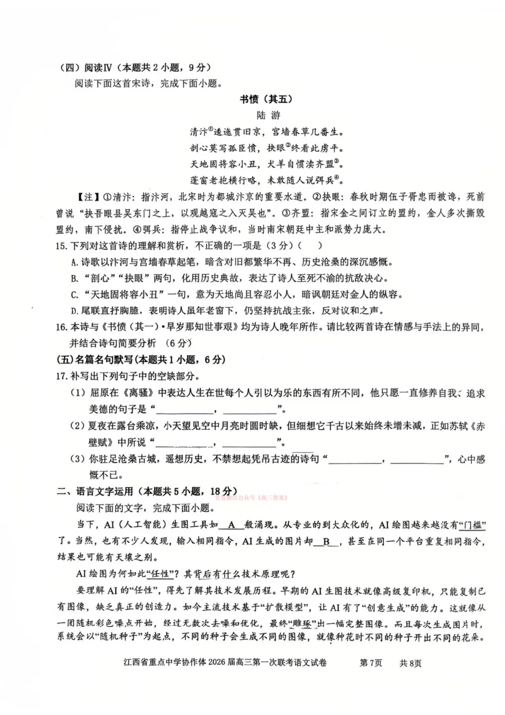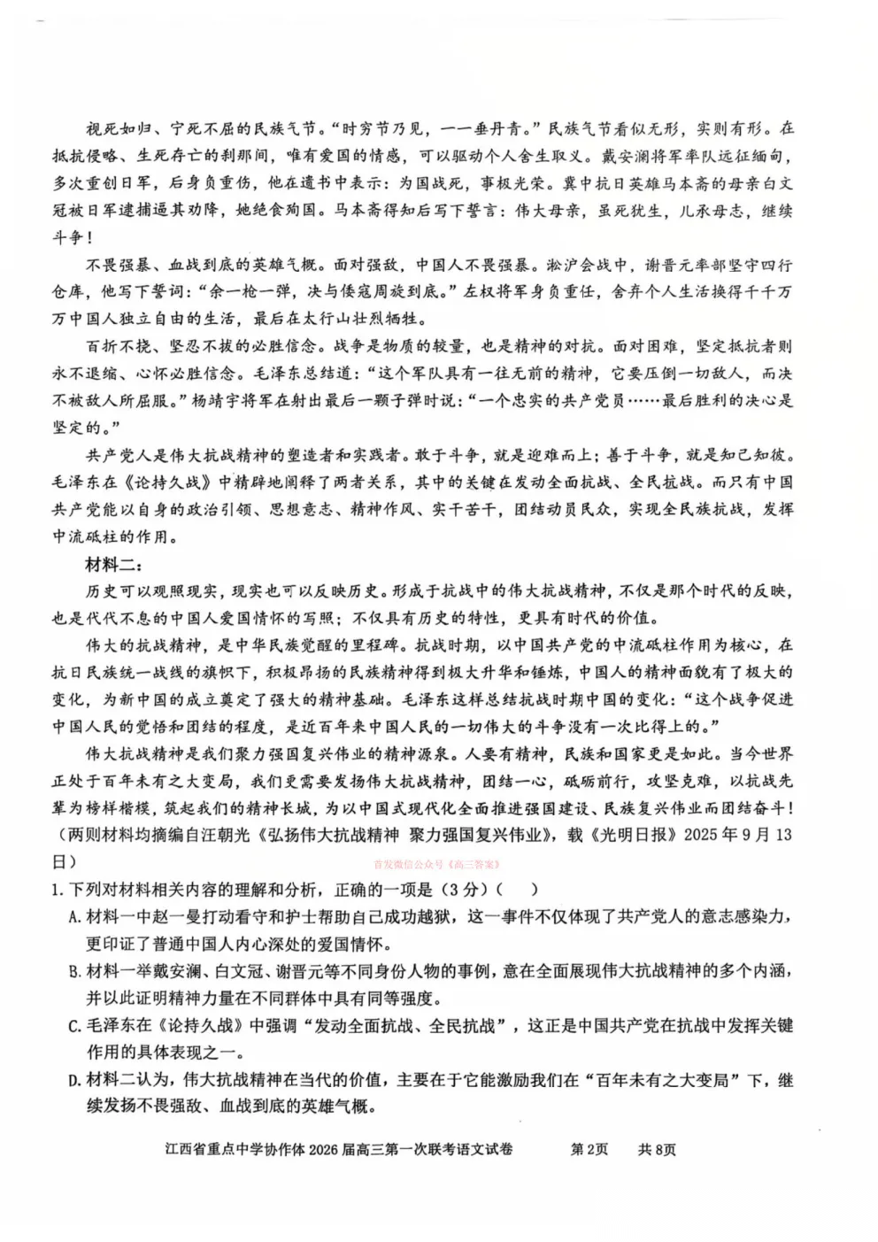 江西省重点中学协作体2026届高三第一次联考答案