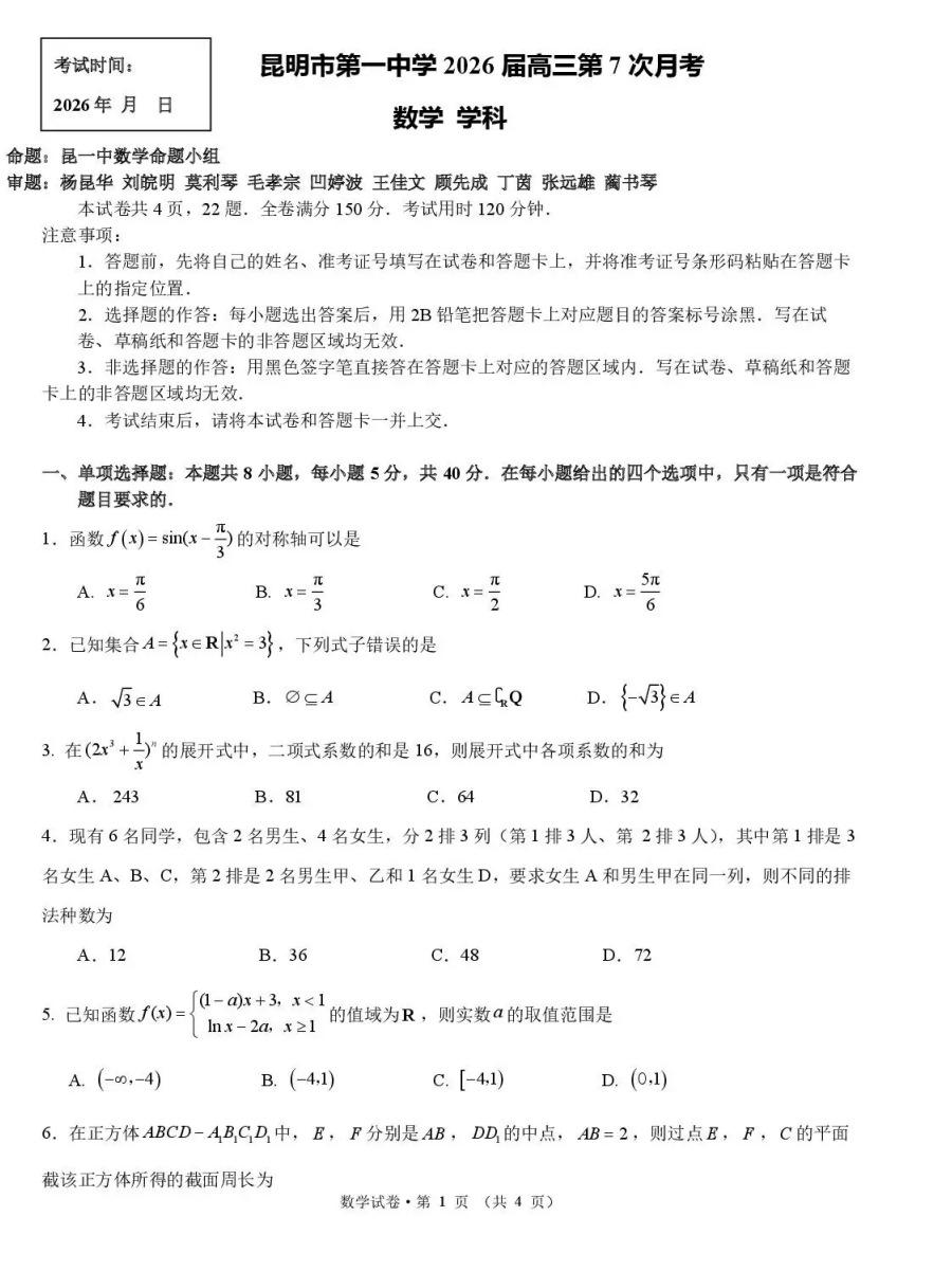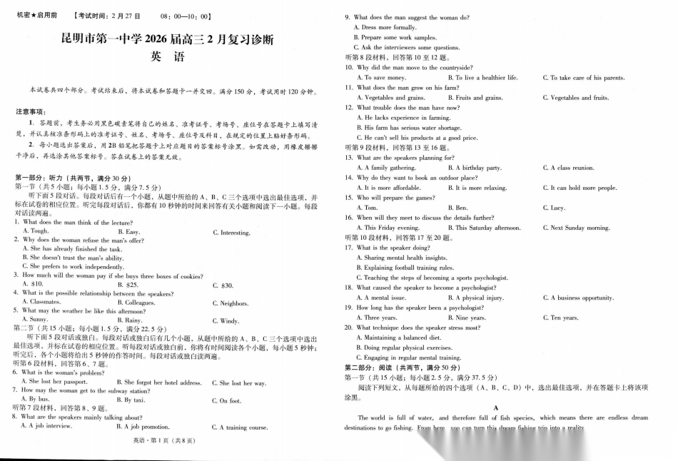 【云南名校】【云南卷】云南省昆明市第一中学2026届高三2月复习诊断(2.26-2.27) 全科试卷+答案