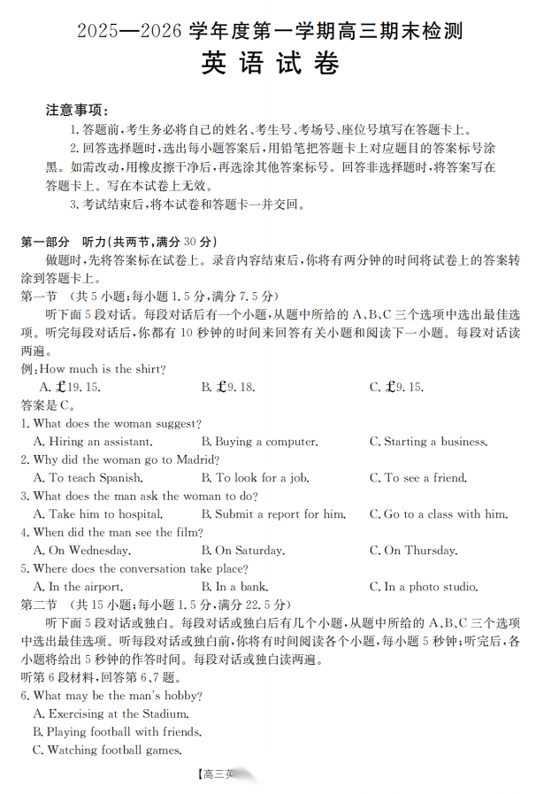 【贵州卷】贵州省黔东南州·金太阳·2025-2026学年度第一学期高三期末检测(26-238C)(1.29-1.30) 全科试卷+答案