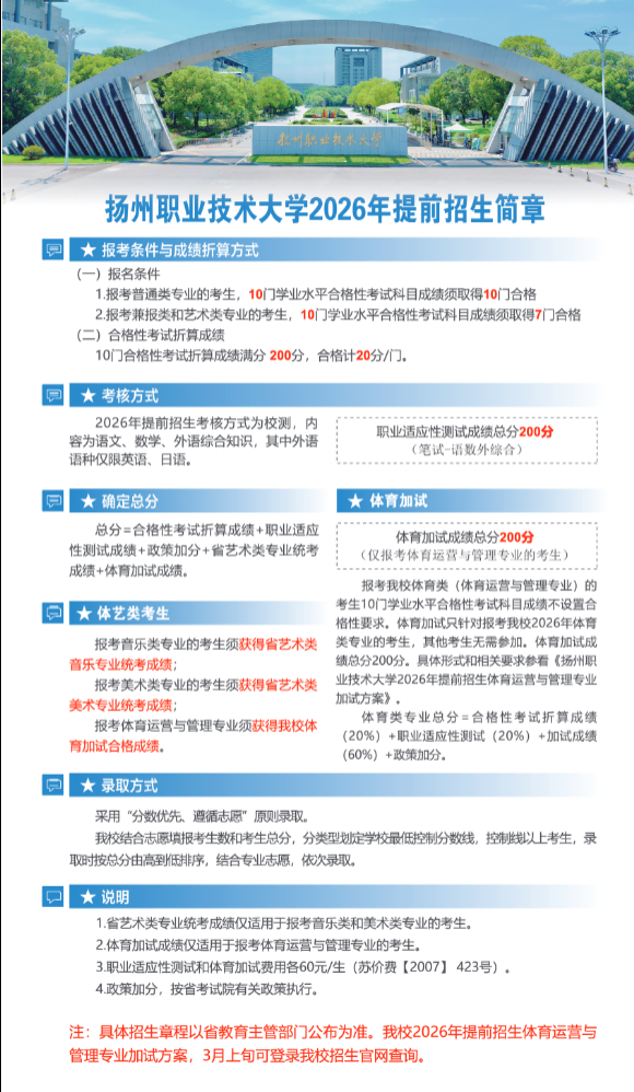 扬州市职业大学2026年提前招生简章 扬州职业技术大学2026年提前招生简章