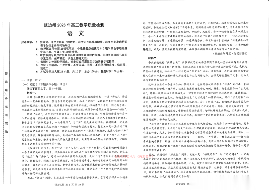延边州2026年高三教学质量检测