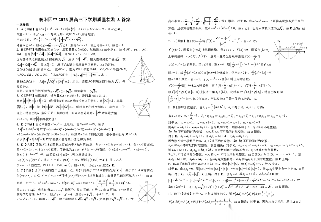 襄阳四中2026届高三2月质量检测答案