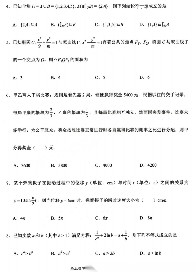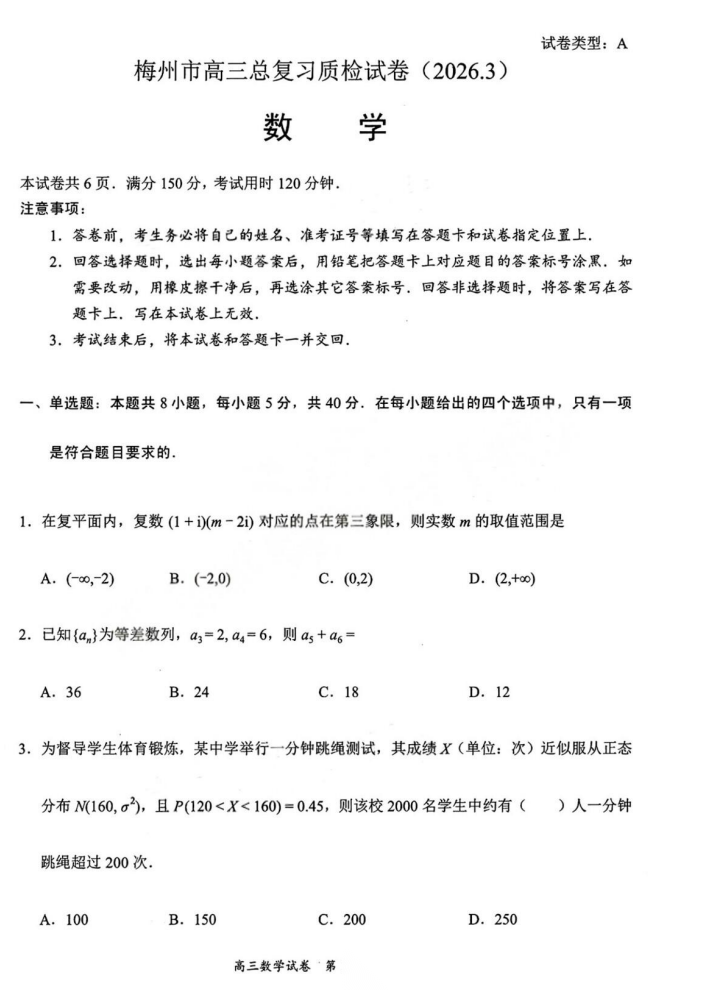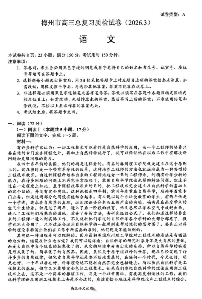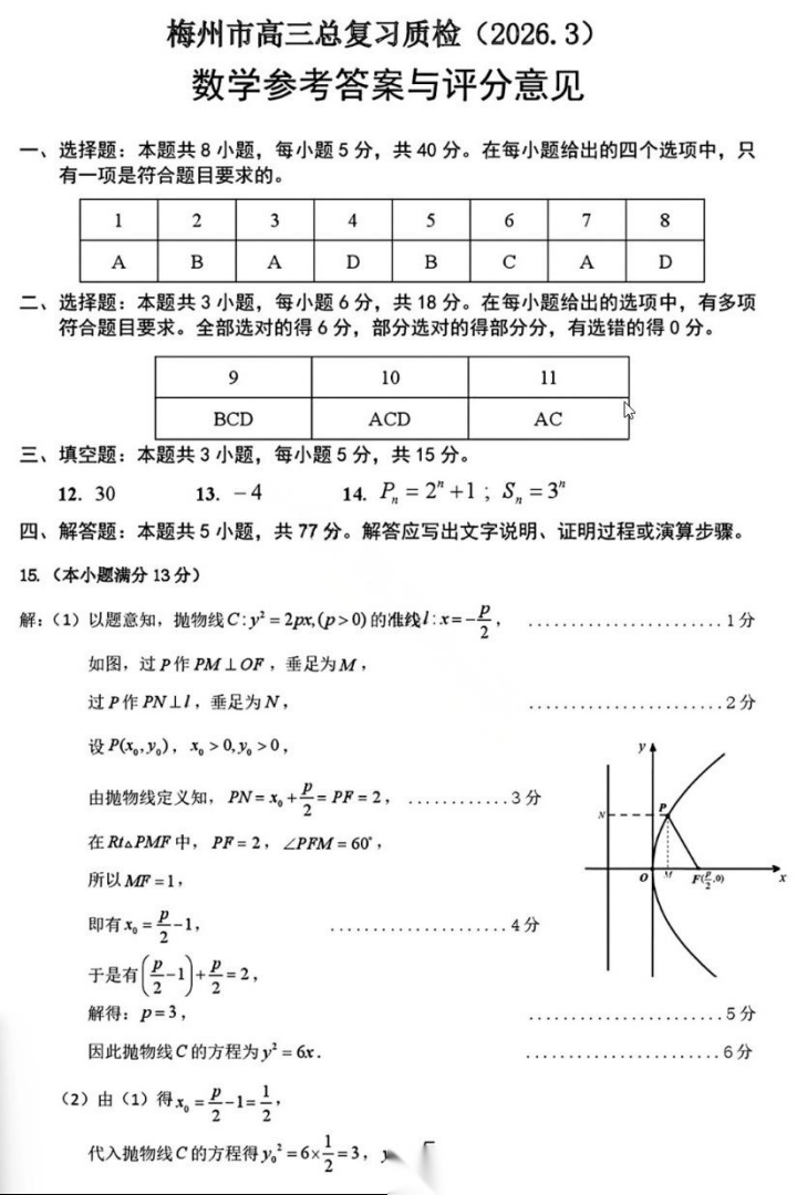 【广东卷】广东省梅州市2026届高三年级3月总复习质检试卷(梅州一模)(3.2-3.4) 数学语文试题卷+答案