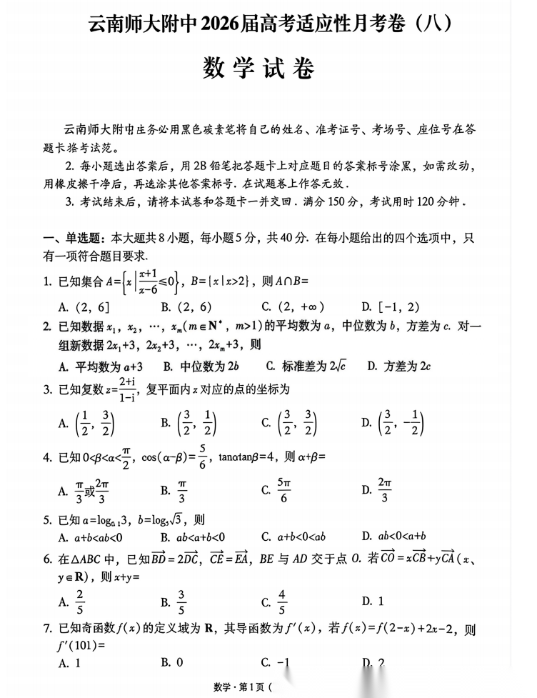 【百强校】【云南卷】云南省云南师大附中2026届高考适应性月考卷(八)(2.27-2.28) 全科试卷(缺史地)+答案