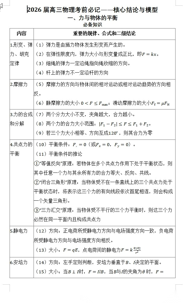 【高考物理】【物理二轮】备战2026高考物理--2026届高三物理考前必记——核心结论与模型(教师用解析版)(纯净word+ppt版)(完整版)