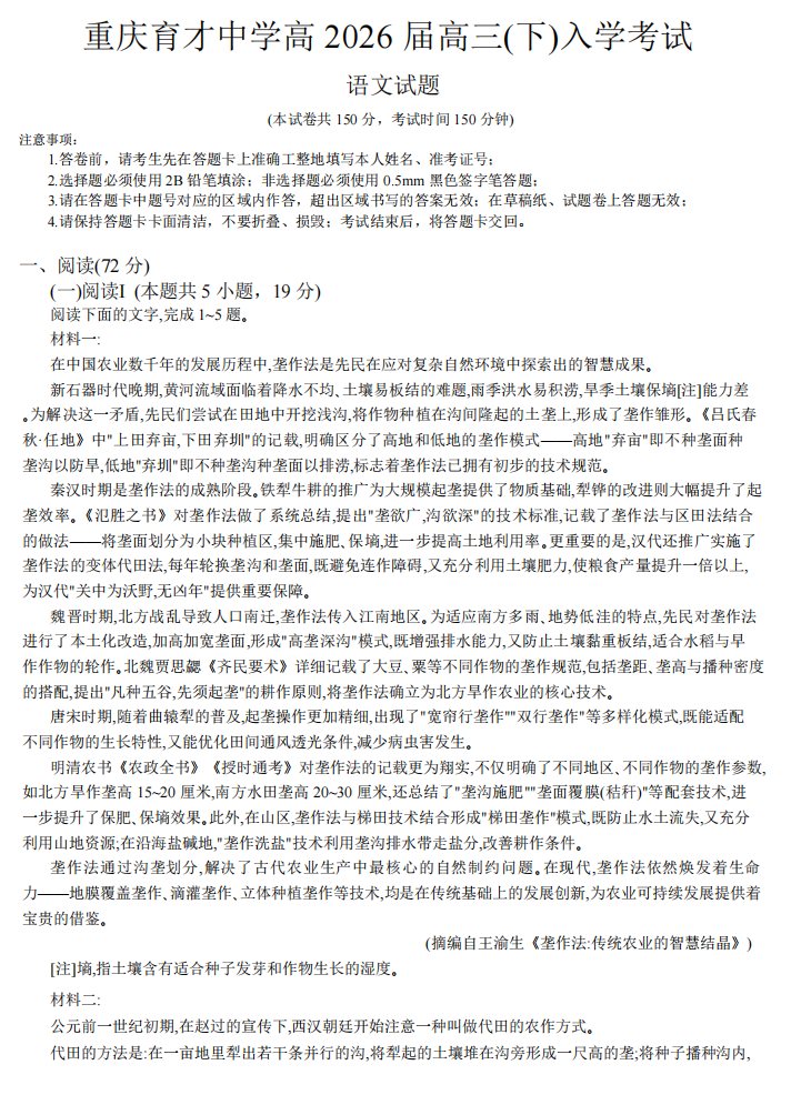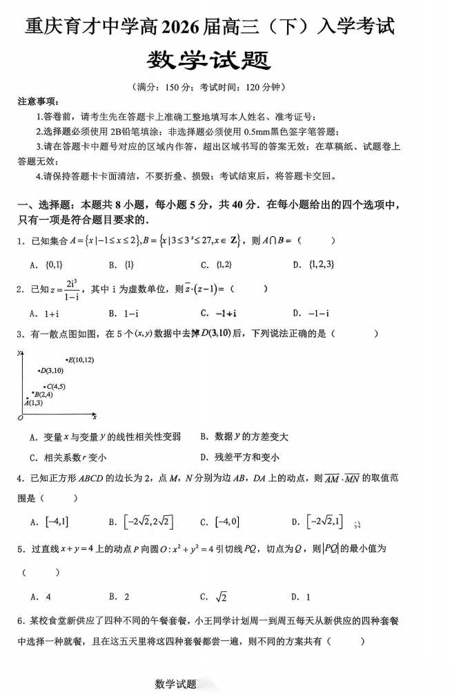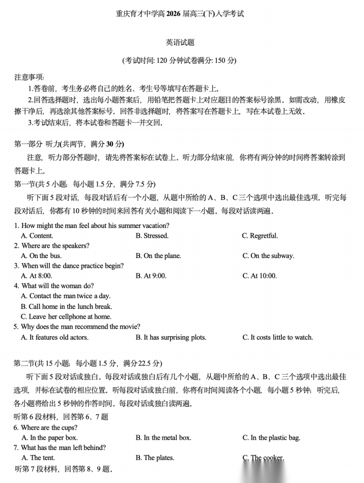 【重庆七龙珠】【重庆卷】重庆市育才中学校2026届高三下学期2月开学考试(2.27-2.28) 全科试卷+答案