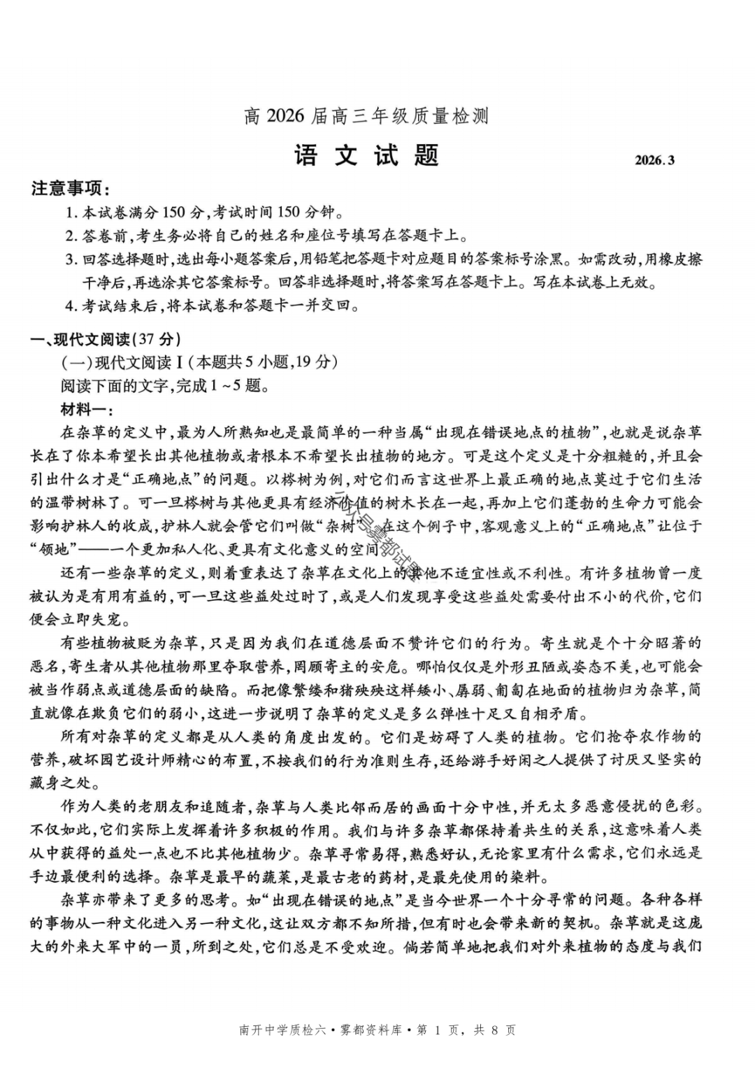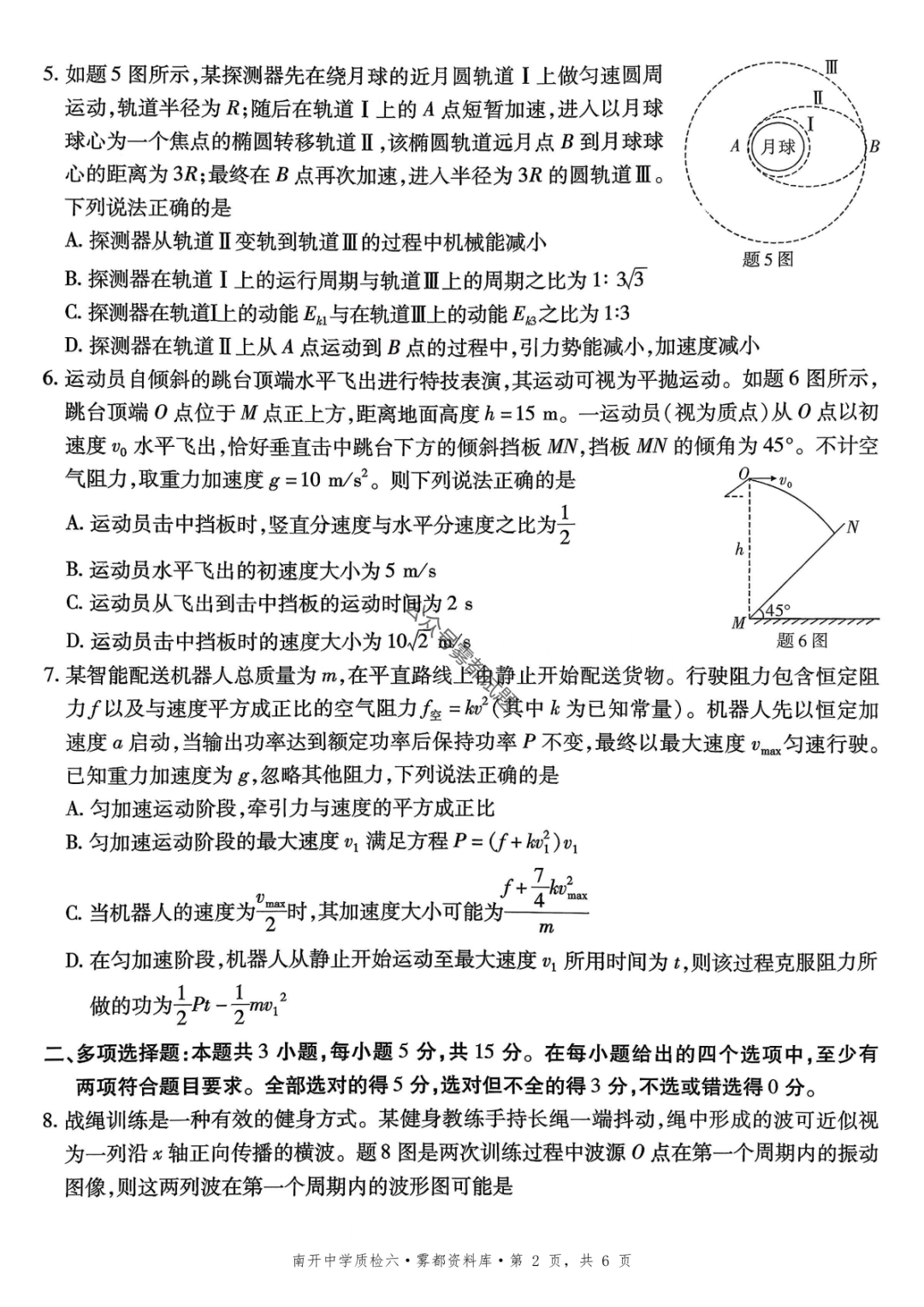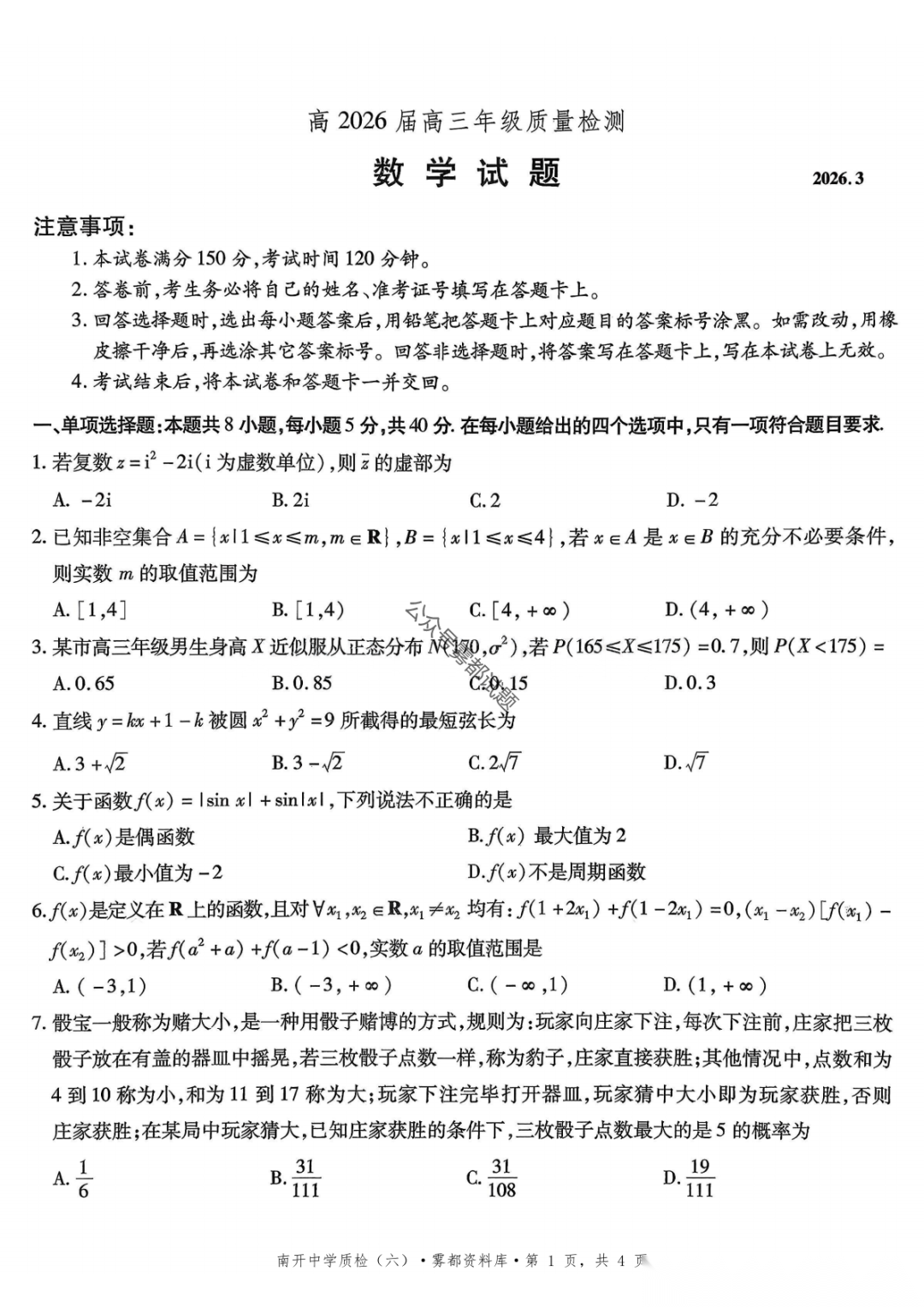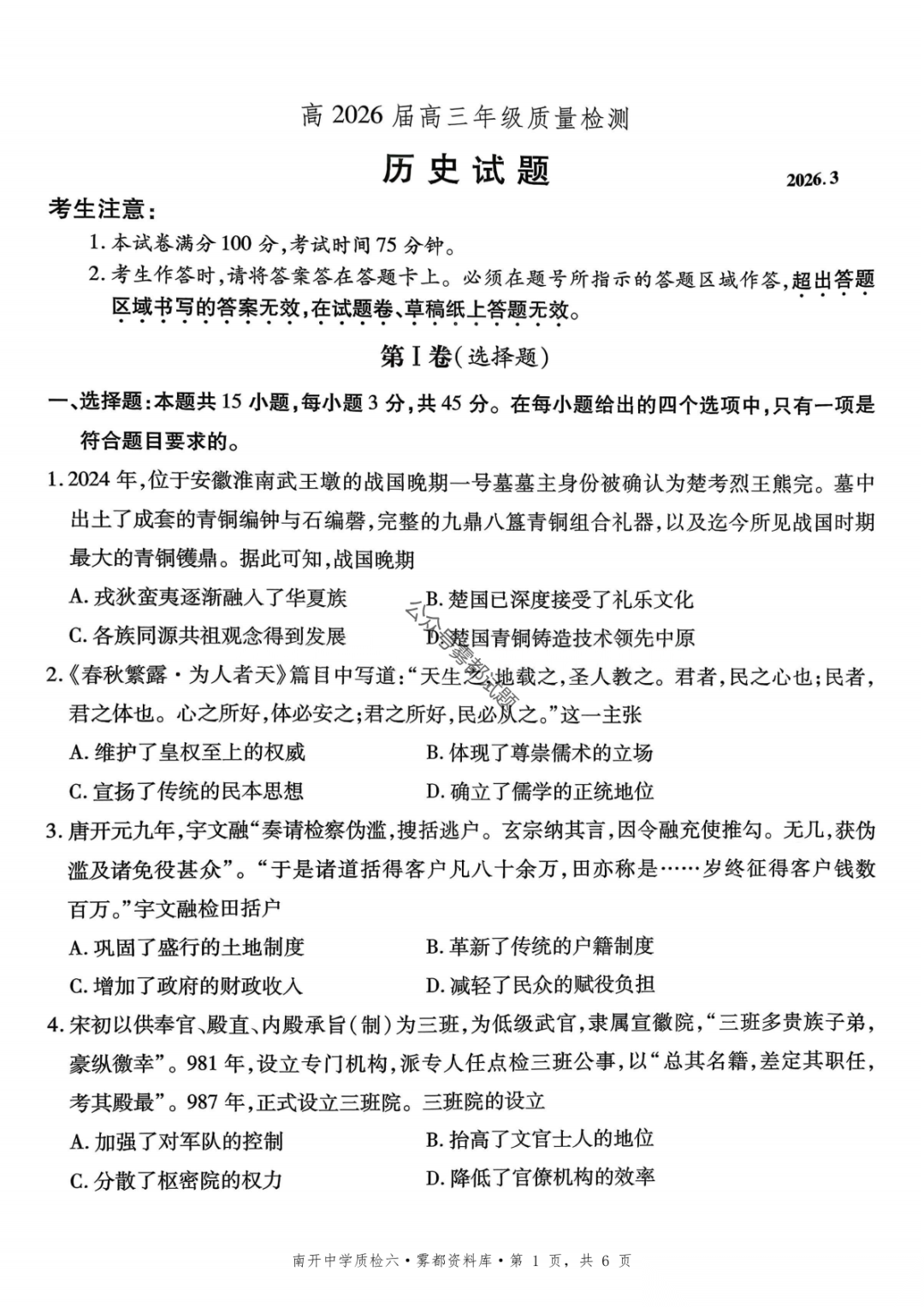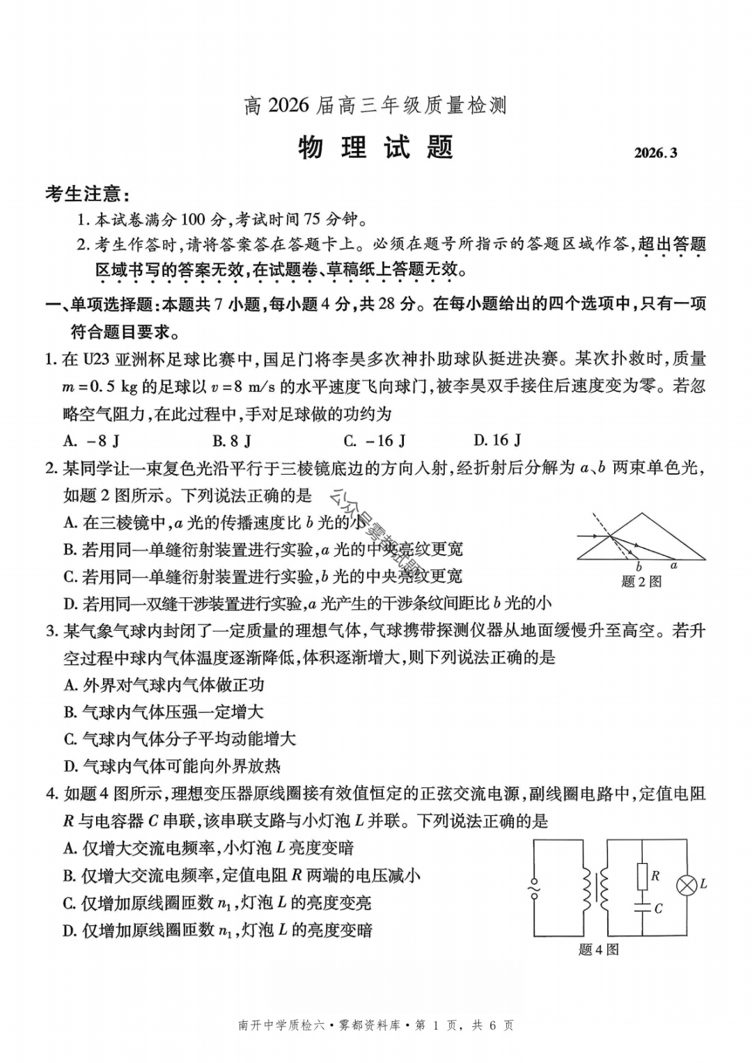 2026届重庆南开中学高三3月联考六语文、数学、物理、历史科目公布