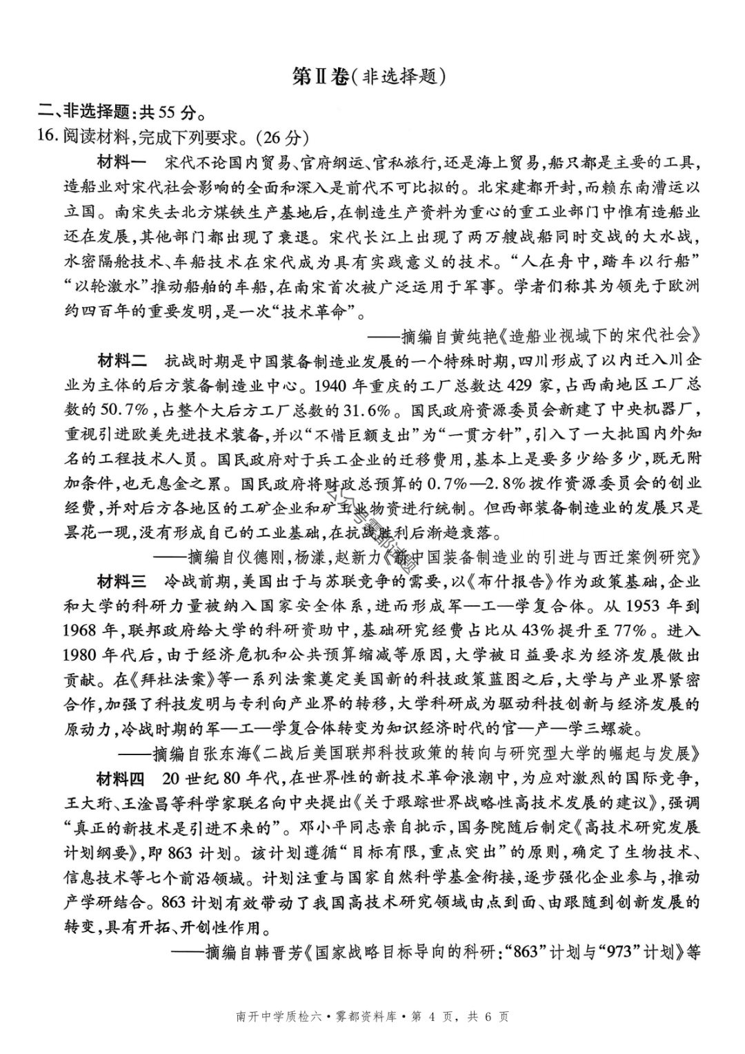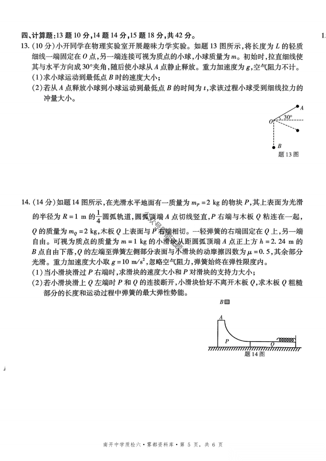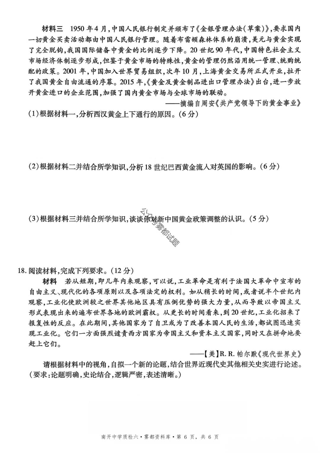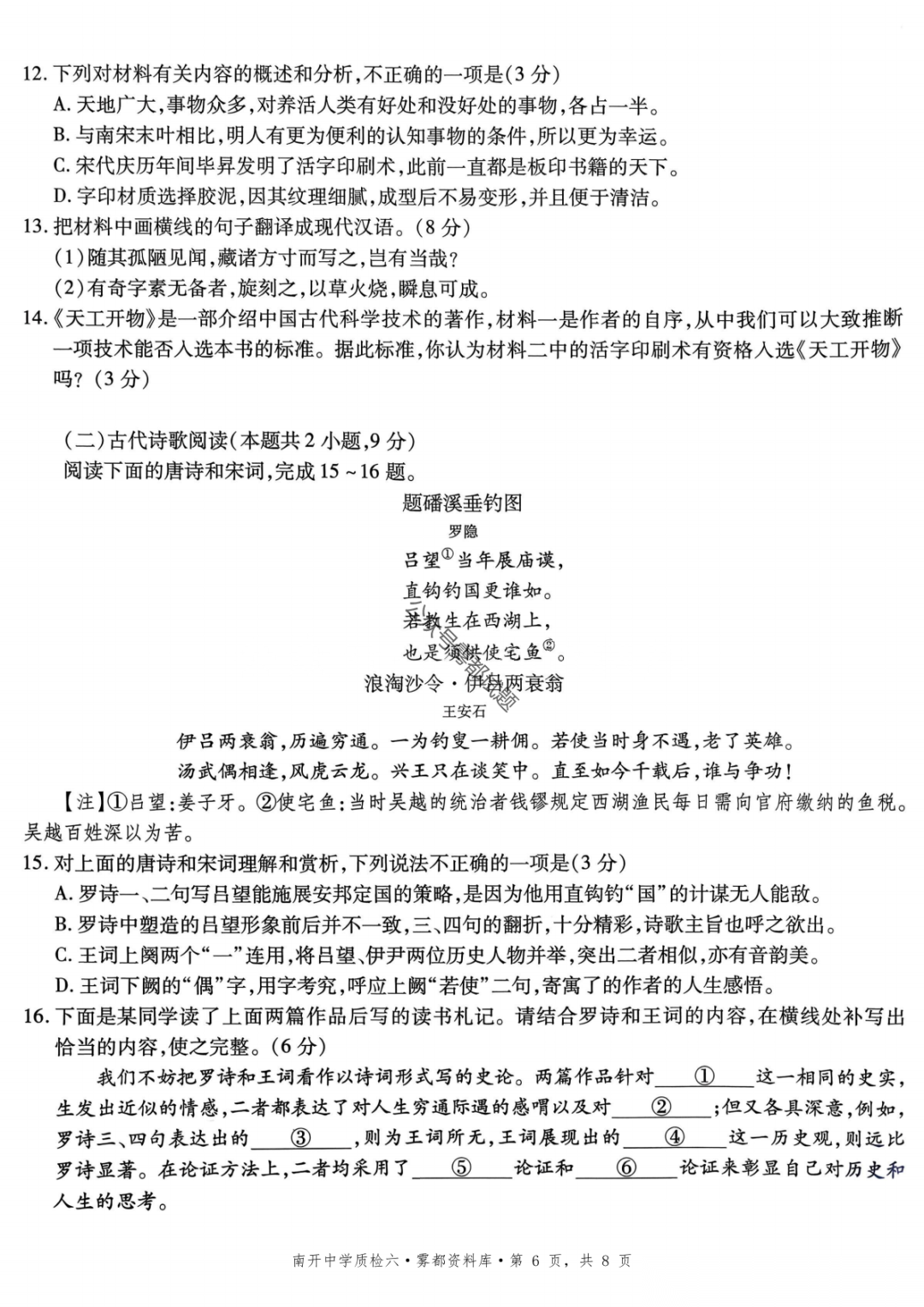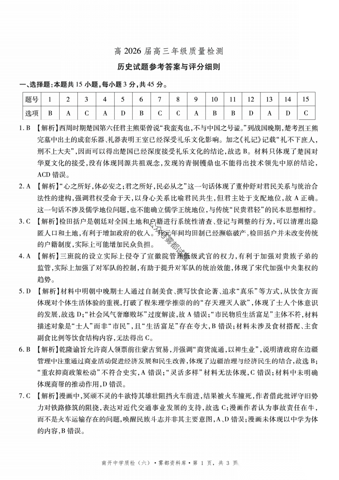 2026届重庆南开中学高三3月联考六语文、数学、物理、历史科目公布